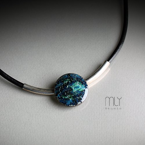 Efektowny ceramiczny wisior, ręcznie wykonany z mocno spieczonej czekoladowobrązowej gliny kamionkowej, jednostronnie szkliwiony mieszanką zielonych szkliw z efektem plamek, tył surowy,ciemnobrązowy, zawieszony na grubym rzemieniu jubilerskim z zapięciem w kolorze srebrnym. Średnica elementu ceramicznego około 27mm, obwód linki ok 44cm (plus 10cm łańcuszka regulacyjnego). Polecam. Termin realizacji zamówienia to 1-2 dni.