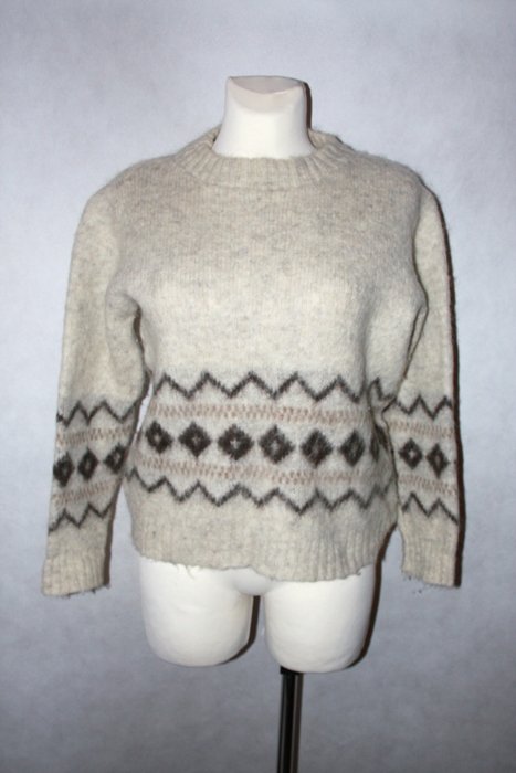 islandzki wełniany, krótki, grubszy sweter we wzory, trochę gryzący