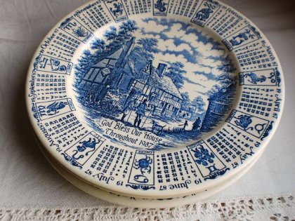 Porcelanowe, duże talerze angielskie, sygnowane EIT England ( 2 bez sygnatury ) przedstawiające dom z podpisem God Bless Our House i datą 1987. Na brzegu dodatkowo kalendarz ze znakami zodiaku - świetny komplet dla urodzonych w 1987 - symboliczny i wyjątkowy. Kolor ecru, malatura niebieska. Sztuk 5.