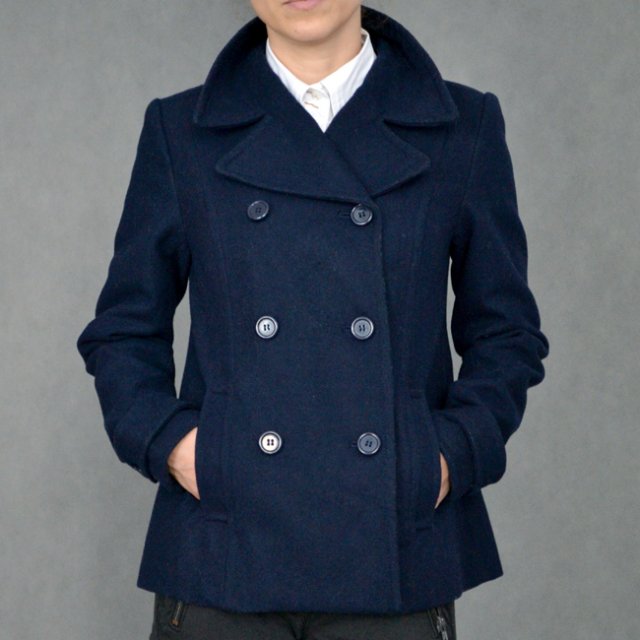 Granatowy, krótki płaszczyk - kurteczka w granatowym kolorze. Zapinany na dwurzędowe guziki, po bokach kieszonki. Na podszewce. Posiada fajny, duży kołnierz. Ekologiczny - wełna wykorzystana z recyklingu ;) Ciepły.