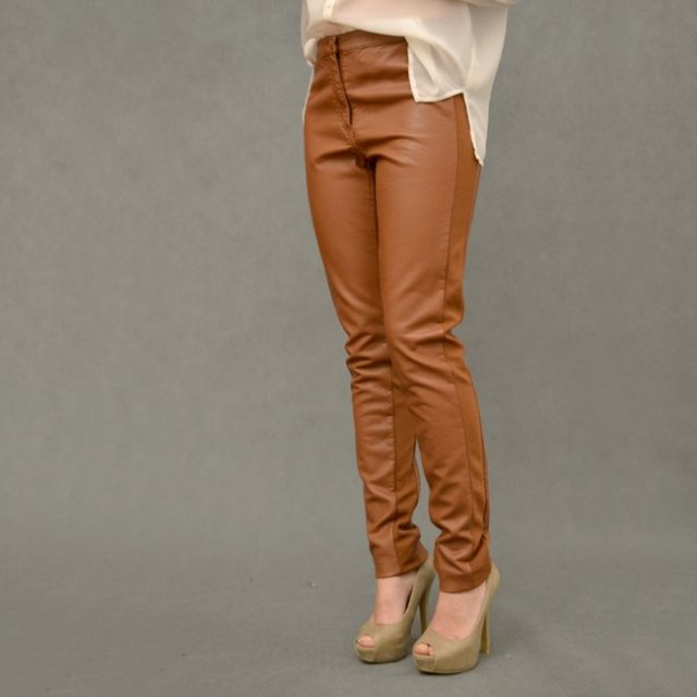 Świetne karmelowe spodnie od H&M o dopasowanym kroju. Z eko skóry z elastycznymi lampasami po bokach.