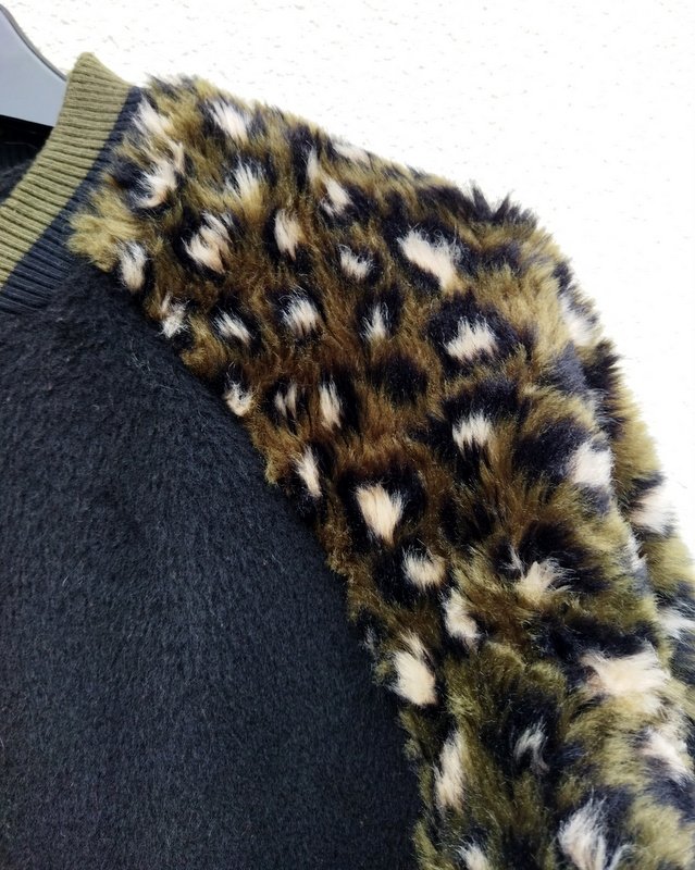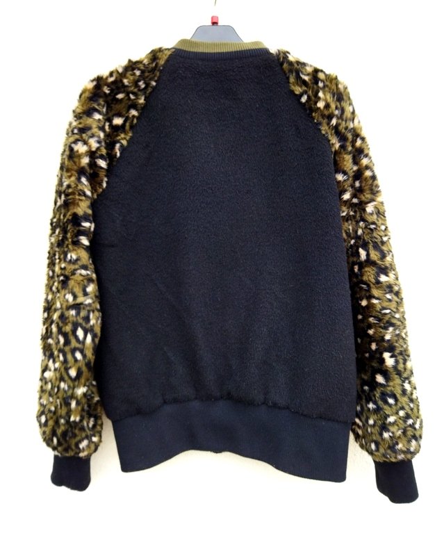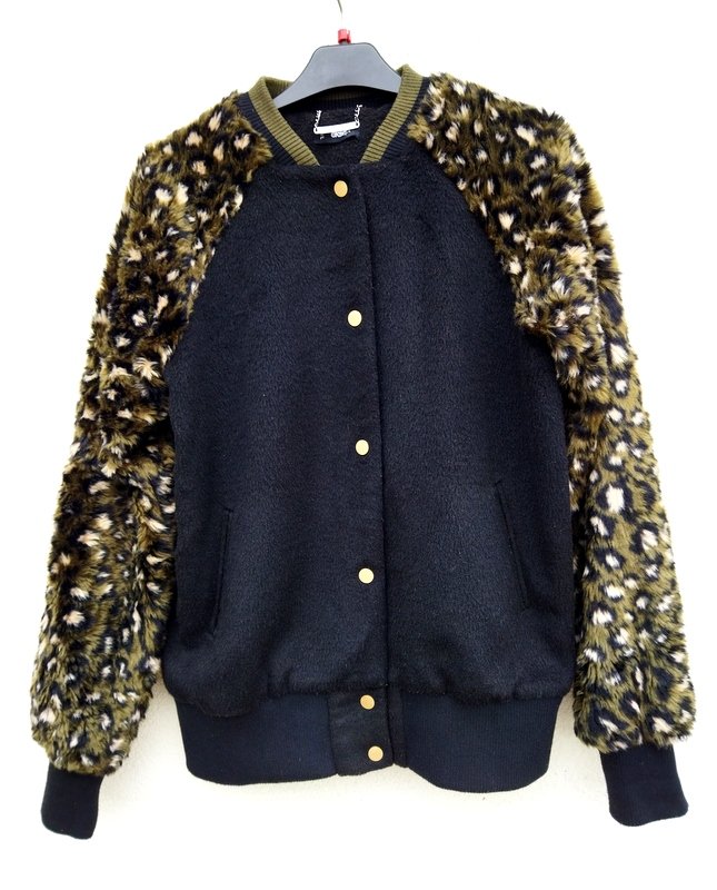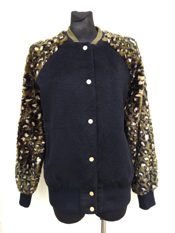 Kurtka bomberka z łączonych materiałów czarnej tkaniny poliestrowej z włoskiem i futerka w cętki w kolorach czerni, zieleni i bieli. Z dwiema wpuszczanymi kieszeniami. Zapinana na napy. Wykończona dzianinowymi ścigaczami, na podszewce