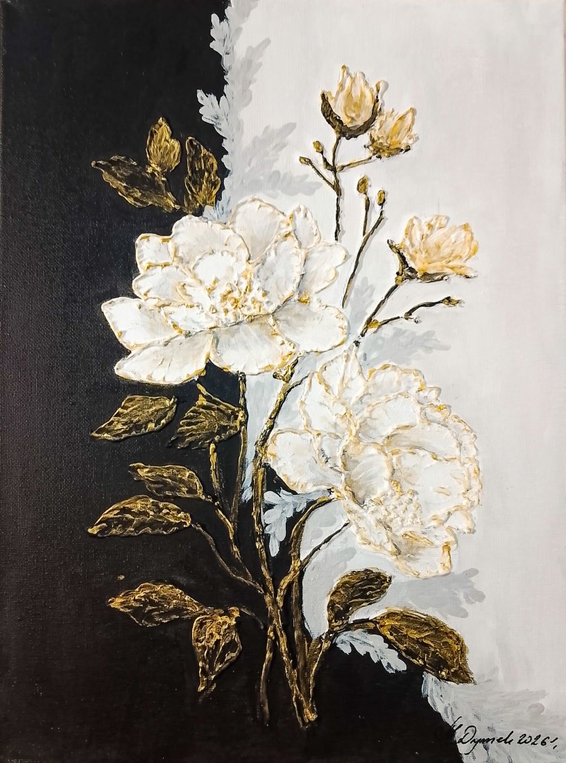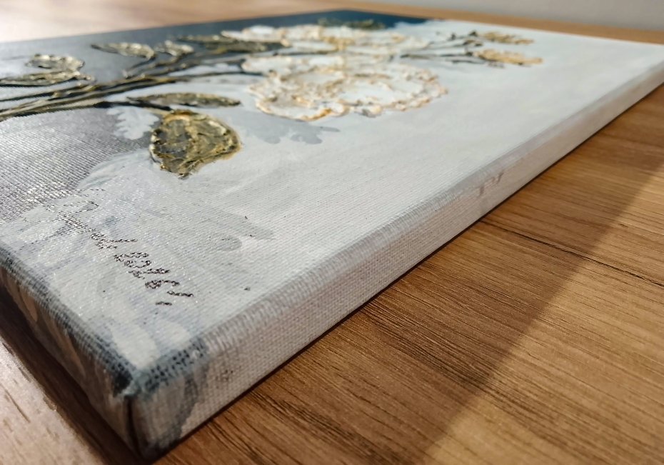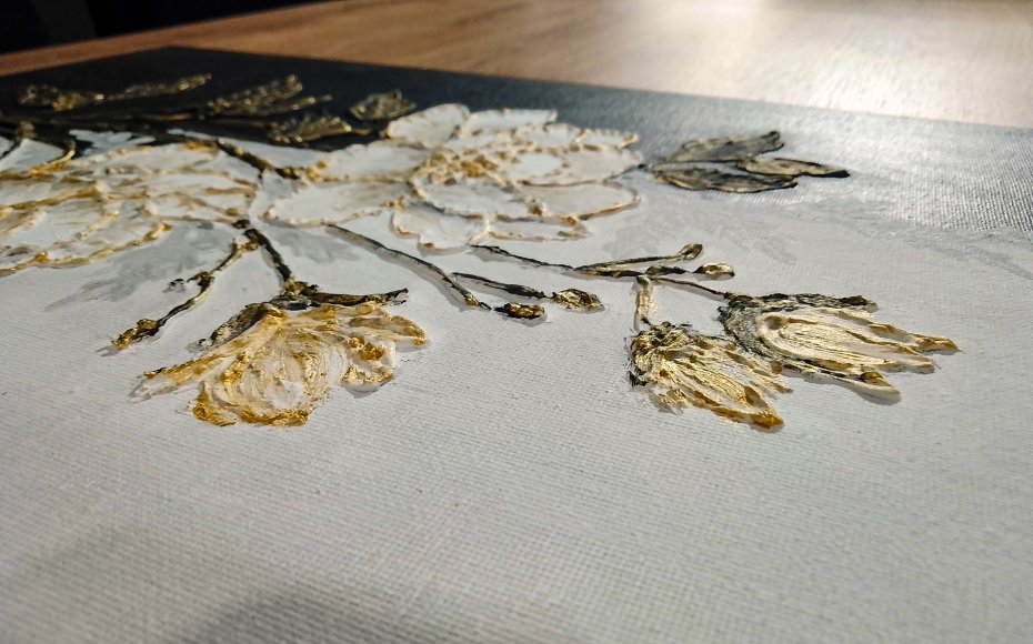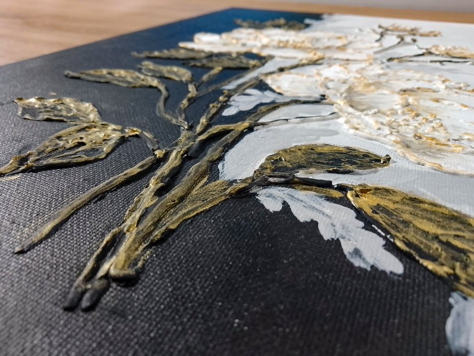 Dopełnij swoje wnętrze nutą luksusu - unikatowy, ręcznie malowany obraz o motywie florystycznym, który łączy w sobie klasyczną elegancję bieli z luksusowym blaskiem złota. Totalna nowość w naszej galerii! Obraz strukturalny (impasto) nadający kwiatom trójwymiarowy efekt i sprawia, że obraz "żyje" i mieni się w zależności od oświetlenia.