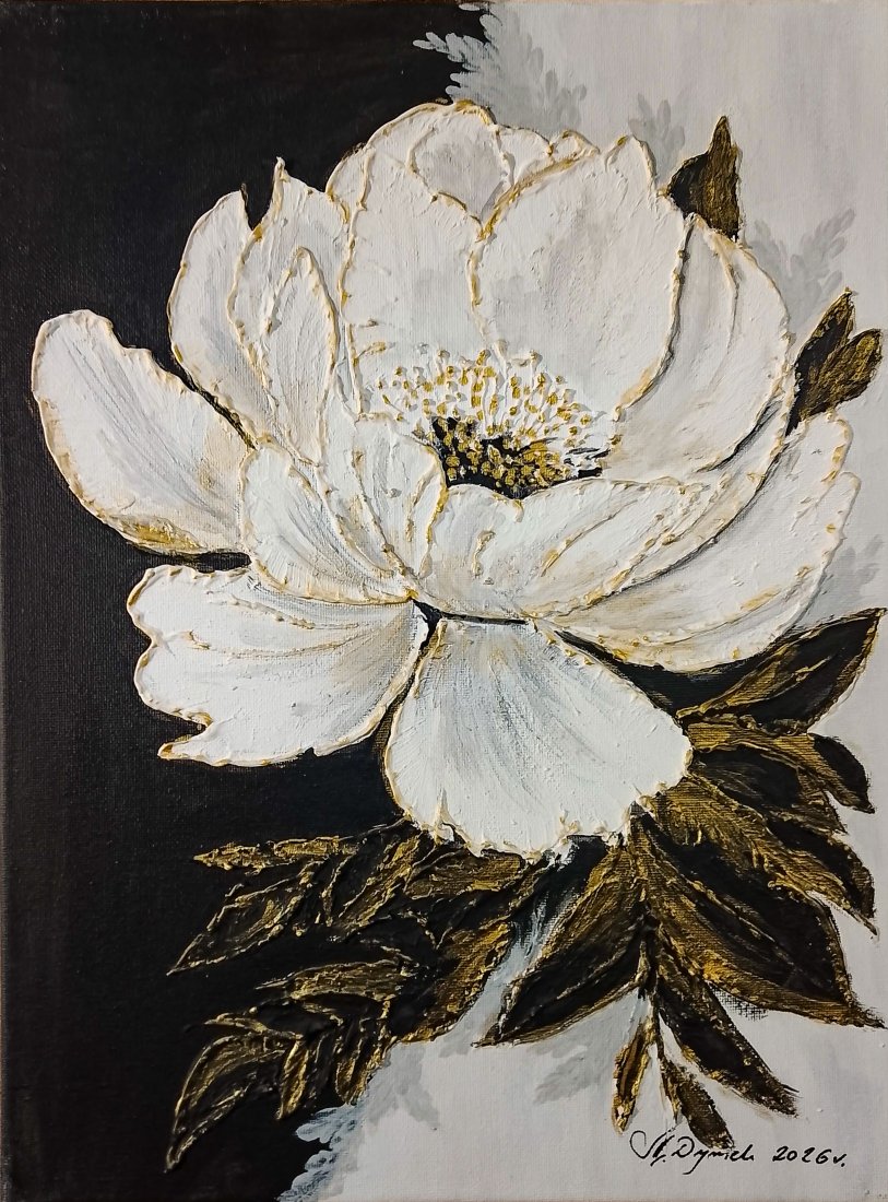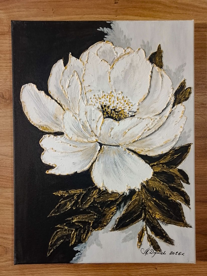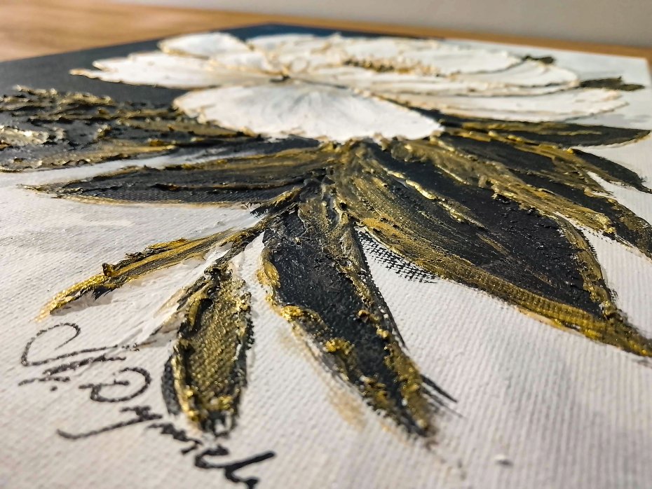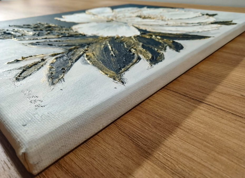 Dopełnij swoje wnętrze nutą luksusu - unikatowy, ręcznie malowany obraz przedstawiający monumentalny biały kwiat na ciekawie kontrastującym ciemnym tle. Totalna nowość w naszej galerii! Obraz strukturalny, łączący w sobie nowoczesną formę z głęboką teksturą 3D oraz pieczołowicie nakładanymi złoceniami, które pięknie mienią się w zależności od kąta padania światła.