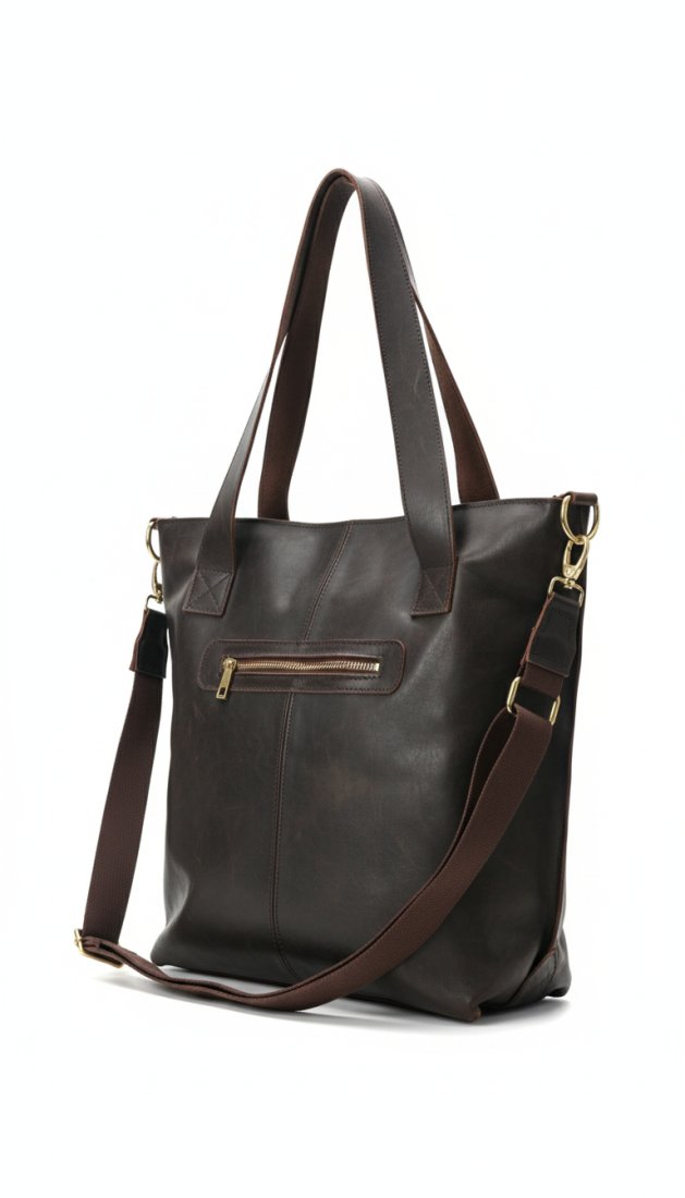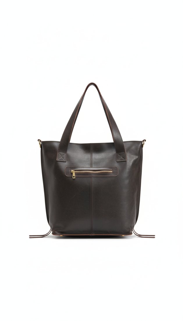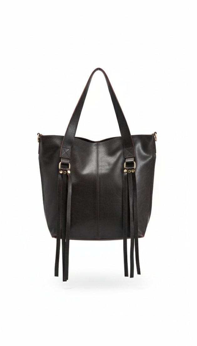 Wyjątkowa torebka damska wykonana w 100% z naturalnej, miękkiej skóry w kolorze głębokiego brązu to doskonały wybór dla kobiet ceniących luksus i trwałość. Klasyczna sylwetka typu shopper została ozdobiona eleganckimi frędzlami i detalami ze złotymi okuciami, które podkreślają niepowtarzalny charakter produktu. Torebka wyposażona jest w długie uchwyty oraz dodatkowy, regulowany pasek na ramię, dzięki czemu możesz nosić ją tak, jak lubisz. Na tylnej stronie znajduje się praktyczna kieszonka na zamek - idealna na klucze lub telefon.