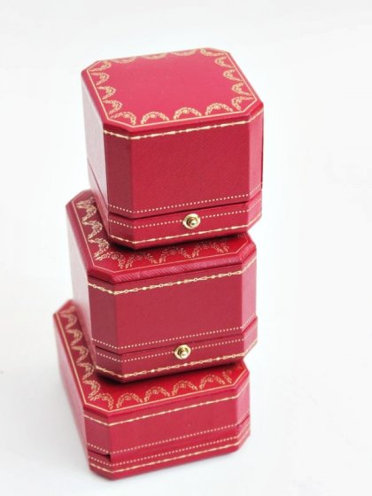 Zestaw 3 ekskluzywnych pudełek na biżuterię. Są to oryginalne pudełka ekskluzywnej marki Cartier. Pudełka w kolorze czerwonym zdobione delikatnym wzorem w kolorze złotym. Bardzo wysoka jakość wykonania jak na tą markę przystało. Solidne zamykanie, otwierane metalowym przyciskiem. Dwa pudełka mają wnętrze wyściełane w kolorze białym oraz napis w kolorze złotym Cartier Paris London New York. Trzecie pudełko wyłożone czarnym materiałem i napis wewnątrz w kolorze złotym Cartier. Dwa pudełka posiadają też na spodzie na zewnątrz dwa numery w złotym kolorze. Stan idealny jak nowe.