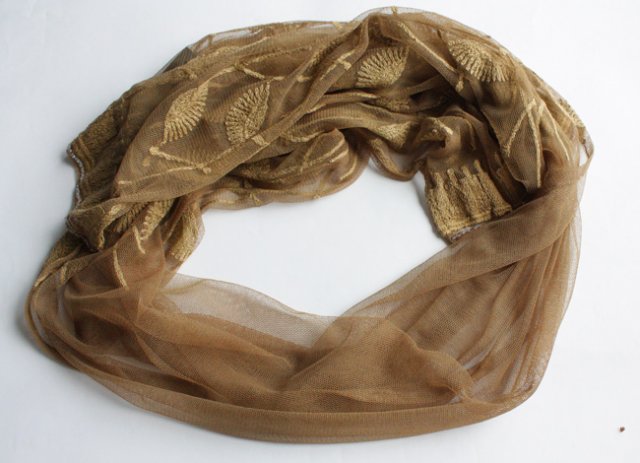 Niezwykle subtelny szal wykonany z cieniutkiego materiału o ażurowej, lekkiej strukturze. Krótsze brzegi obszyte drobniutkimi, subtelnymi koralikami. Szal pięknie wyszywany w delikatne gałązki.