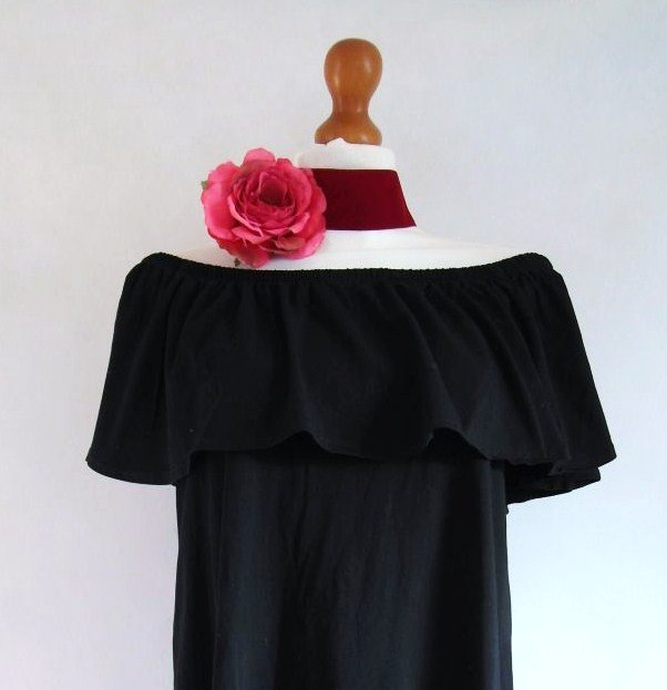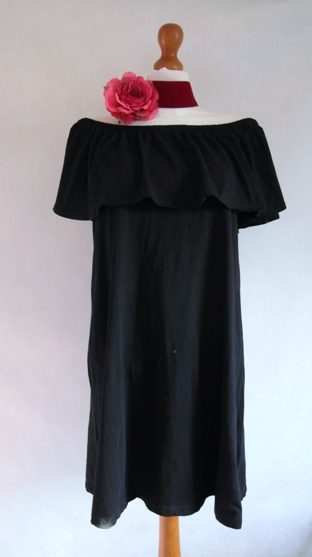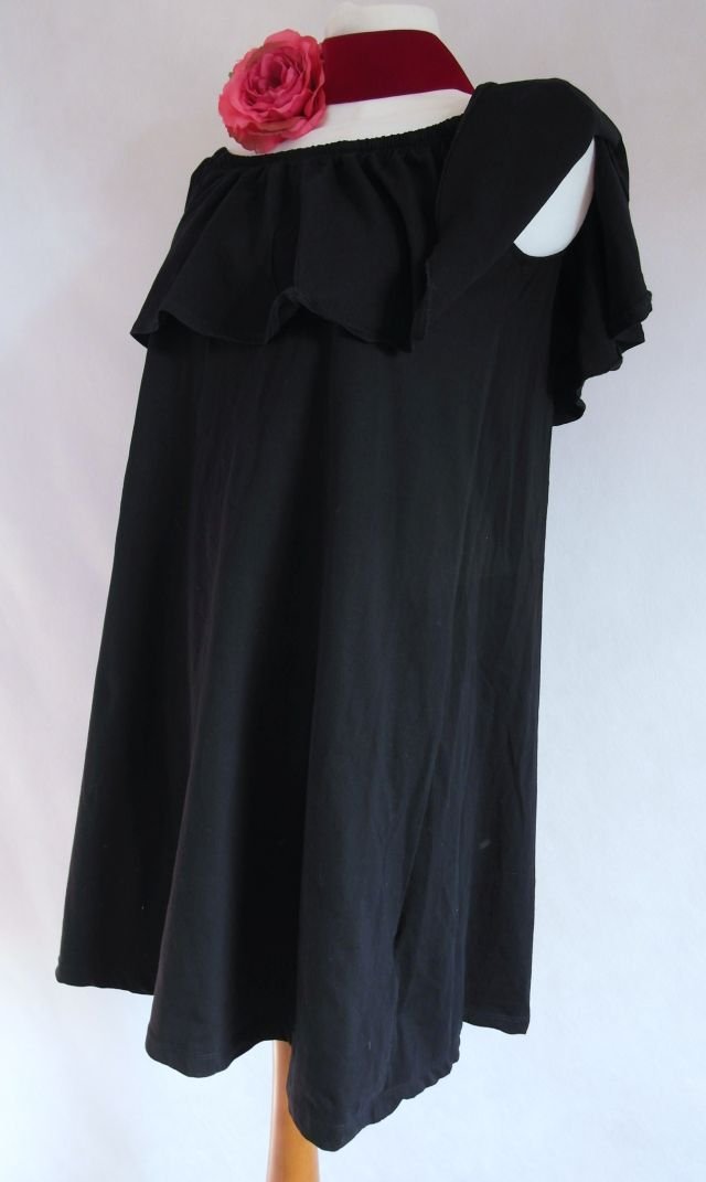 ładna czerń, wokół dekoltu falbana na gumie, można regulować sposób noszenia.delikatnie rozszerzana.na ręce są otwory.