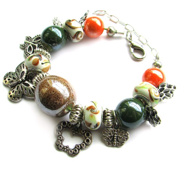 Bransoletka utrzymana w kolorystyce letniej, wykonana na bazie sznurka woskowanego oraz ceramicznych błyszczących korali w kolorze brązowym(nakrapiany koral główny), zielonym i pomarańczowym oraz malowanych koralików modułowych oraz srebrnych przekładek i zawieszek w kształcie motylków.