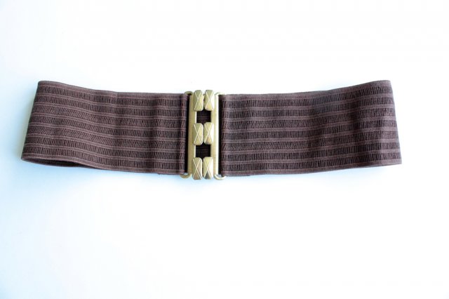 Elastyczny gumowy pasek w odcieniu mlecznej czekolady. Metalowa klamra w kolorze złotym.