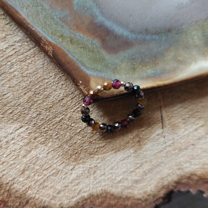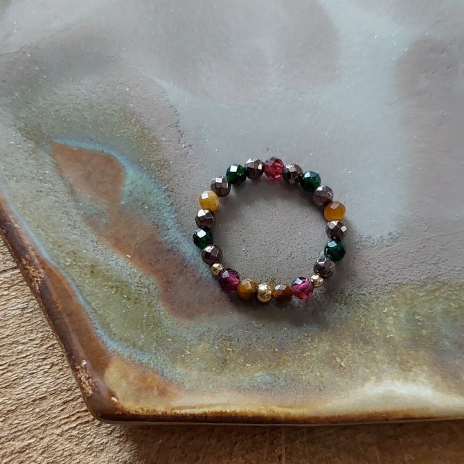 Elegancki, elastyczny pierścionek z minerałami, które pięknie uzupełniają się kolorystycznie tworząc ciepłą mozaikę barw. Kamienie delikatnie błyszczą dzięki fasetowanemu szlifowi, jaki zastosowano w bryłkach minerałów. Znajdziesz tu granat, tygrysie oko, hematyt i szmaragd Nilu. Pierścionek został uzupełniony elementami ze stali szlachetnej w kolorze złotym.