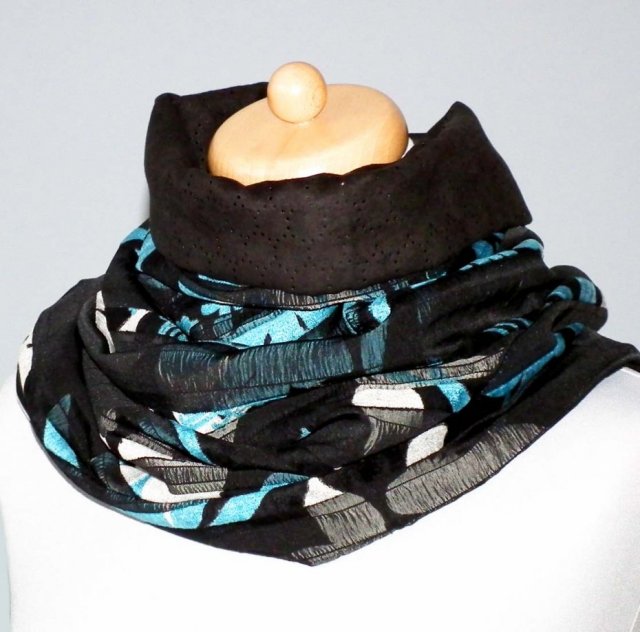 Bardzo elegancki szal, komin, chusta uszyty z ciekawej tkaniny z lekko wypukłymi wzorkami i z miłej tkaniny ażurowej przypominającej cienki zamsz w kolorze czarnym.