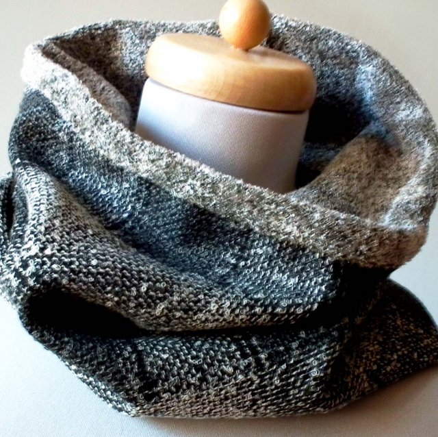Wyjątkowy, bardzo elegancki, modny, wygodny i praktyczny komin, szal-koło, tuba w barwach szarości i grafitu. Szal uszyty z dwóch warstw, wełny w kratkę oraz z jednobarwnej, miękkiej i miłej dla skóry dzianiny boucle w kolorze perłowo-szarym.
