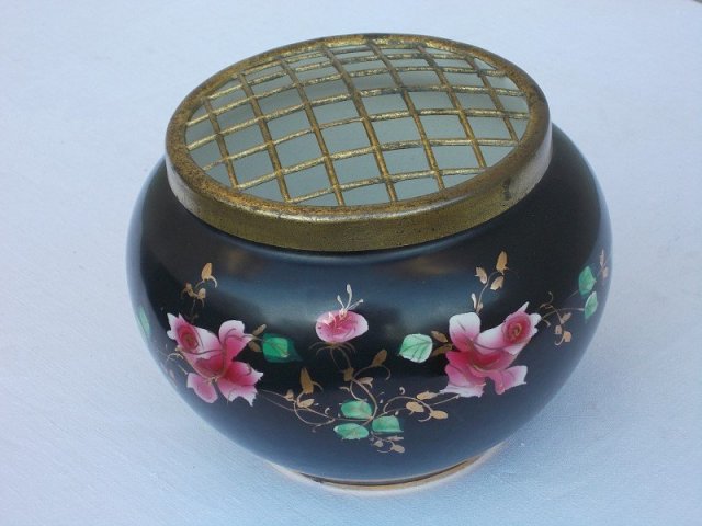 Bardzo kobiece, efektowne naczynie na potpourri. Ceramiczne, z metalową kratkowaną przykrywką stylizowaną na stare złoto. Ręcznie różanym motywem malowane w ciekawym, eleganckim zestawieniu z satynową czernią. Dekoracyjne, także jako wazon stosowane być może, dzięki kratce pozwala na ikebaniczną wyszukaną kompozycję :) Wyjątkowo eleganckie i szykowne. Pełne potpourri z Body Shop. Pękatość 16,5; dół 8,5; wysokość 13 cm. Stan zachowania bardzo dobry.