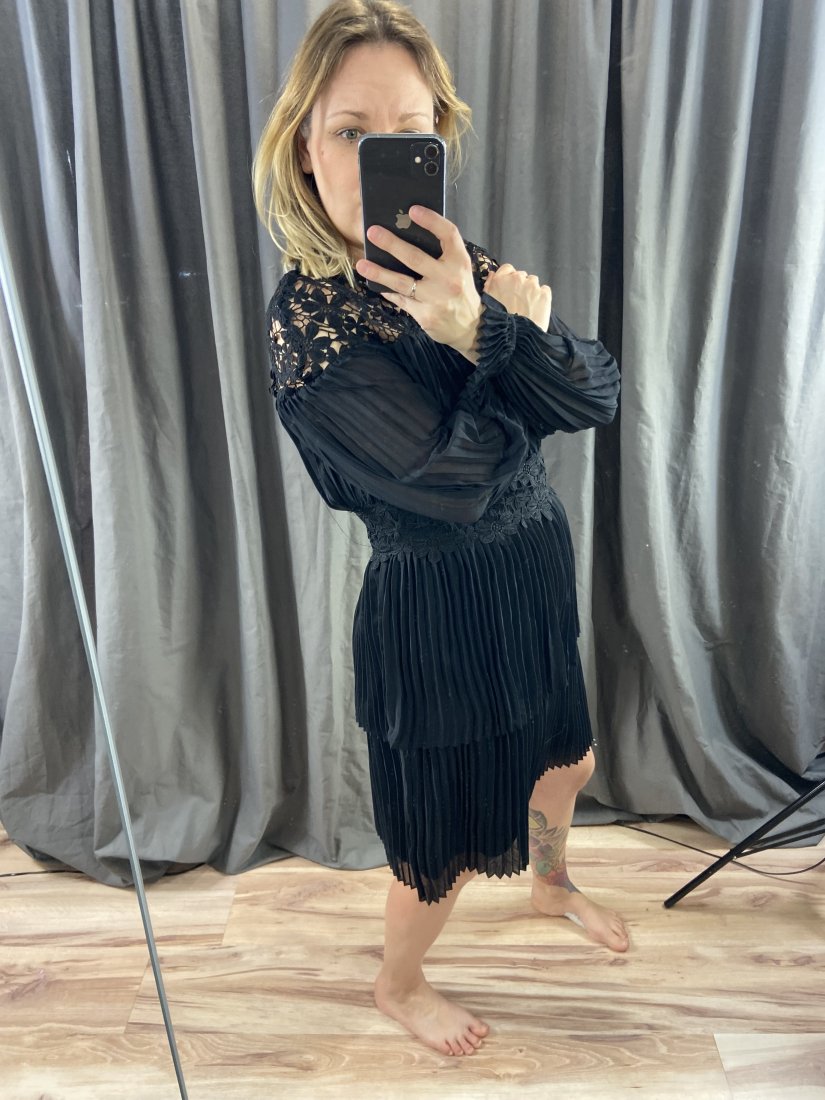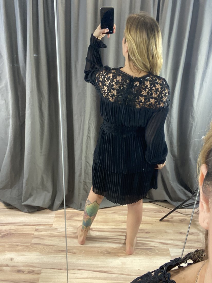 Elegancka sukienka - ażur+plis+falbany. Taliowana. Ze zwiewnego poliestru, na podszewce.