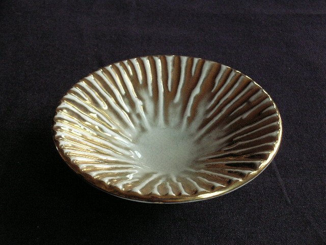Bogato złocony ceramiczny spodek-miseczka, niezwykle dekoracyjna, sygnowana Channel Islands, Great Britain. Wyrób chyba z lat 60-tych - artystyczne wzornictwo, organiczna fakturowość i specyficzne, eleganckie zestawienie kolorów. Stópka złocona. Efektowne na biżuteryjne drobiazgi, do łazienki, sypialni, ale i w kuchni się sprawdzi, bo dobrze szkliwione, więc i na kulinarne drobności służyć może... kawior, oliwki, mmm... :) 10 x 2,5 cm. Stan zachowania bardzo dobry.