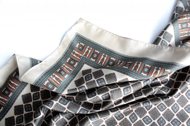 Chusta w ponadczasowe, eleganckie wzory. Materiał to prawdopodobnie jedwab naturalny lub syntetyczny.