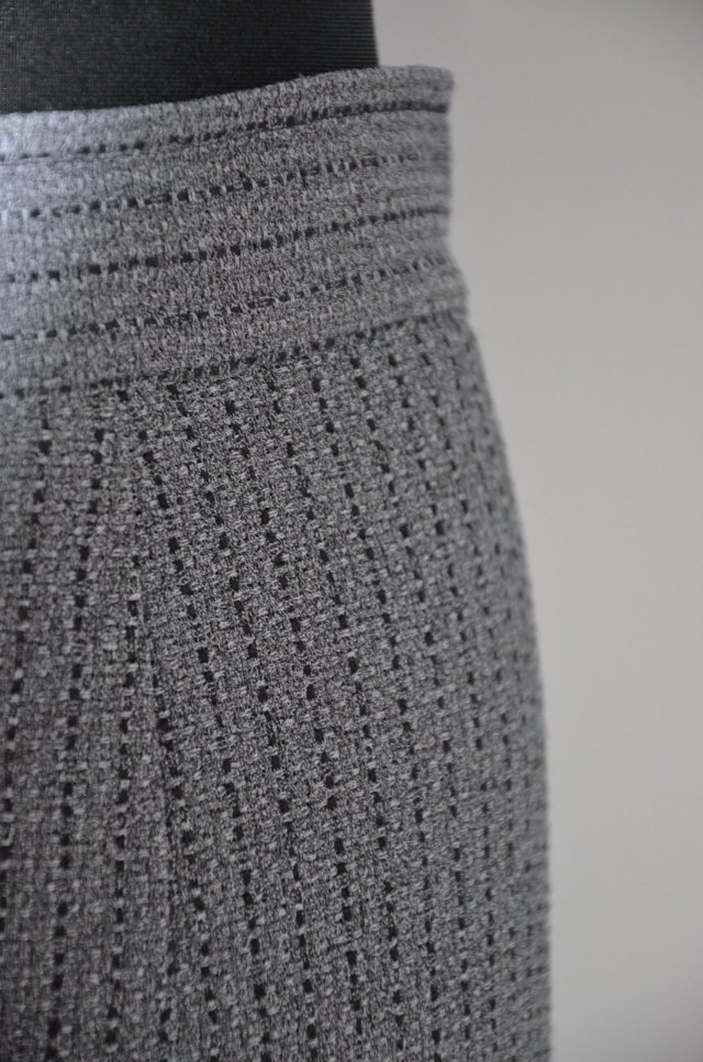 Grafitowa, elegancka spódnica. Krój biurowy, klasyczny, prosty. Wzór w proste, równoległe paseczki. Zapinana na zamek i guzik z tyłu. Z tyłu rozcięcie. Na podszewce.