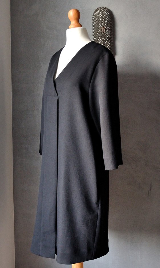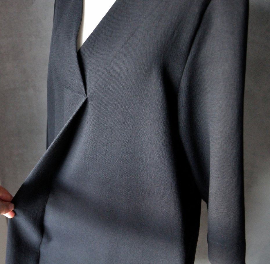 Fason luźny, prosty, niemal klasyczny. Długość midi, trójkątny dekolt z dyskretnym zdobieniem (obszyciem). Od "czubka" dekoltu w dół biegnie pionowa plisa (przywodzi na myśl listwę materiałową, pod którą ukrywa się zapięcia w koszulach, ale tutaj to atrapa).