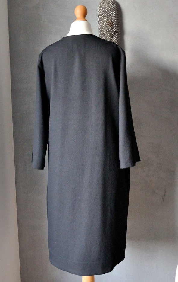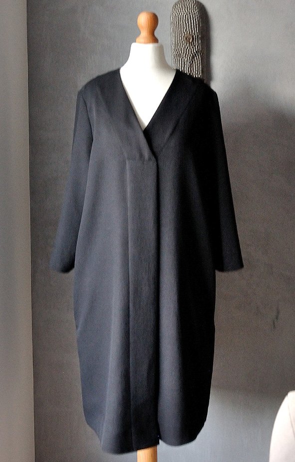 Fason luźny, prosty, niemal klasyczny. Długość midi, trójkątny dekolt z dyskretnym zdobieniem (obszyciem). Od "czubka" dekoltu w dół biegnie pionowa plisa (przywodzi na myśl listwę materiałową, pod którą ukrywa się zapięcia w koszulach, ale tutaj to atrapa).