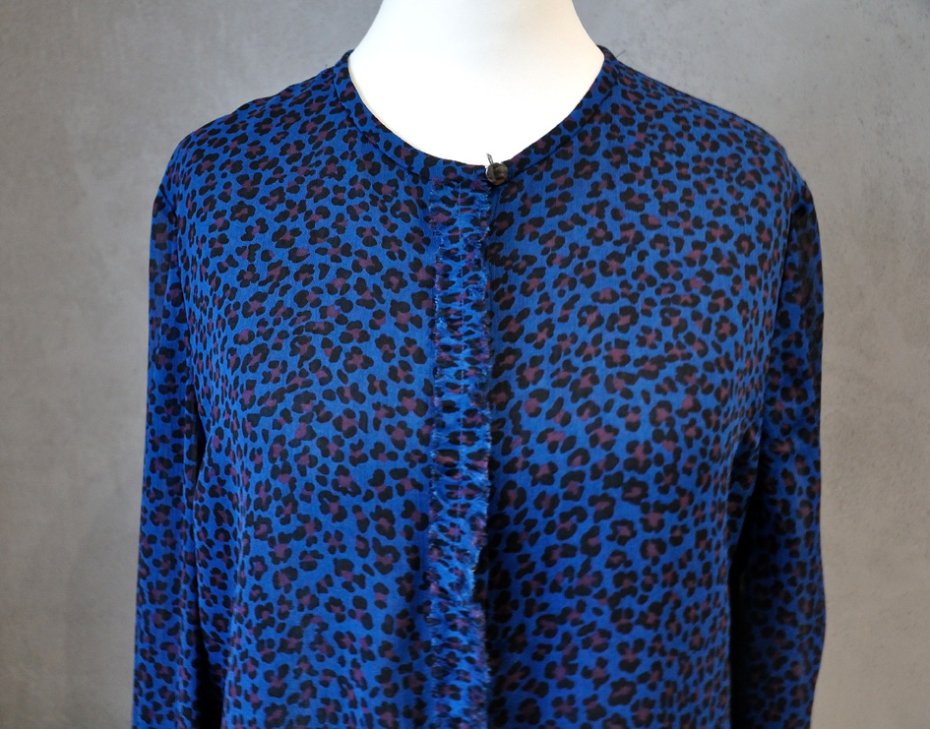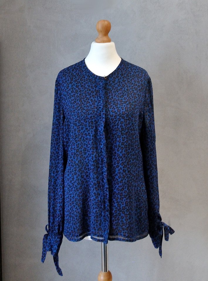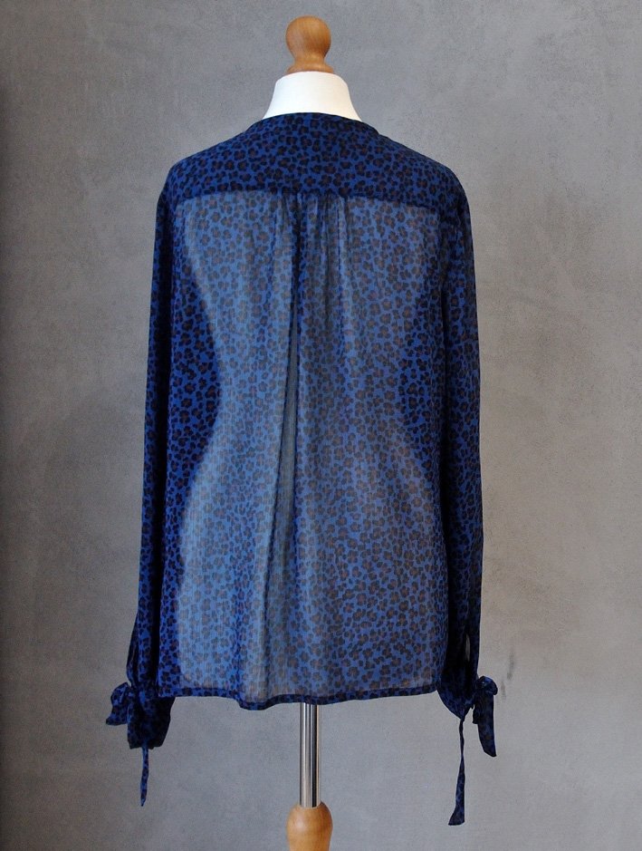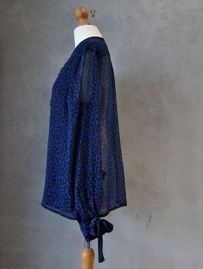 Uszyta z cienkiego, ciemnoniebieskiego szyfony w nieregularny, "ciapkowany" wzór - coś pomiędzy panterką i kwiatkami.