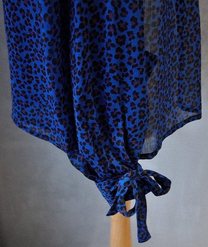 Uszyta z cienkiego, ciemnoniebieskiego szyfony w nieregularny, "ciapkowany" wzór - coś pomiędzy panterką i kwiatkami.