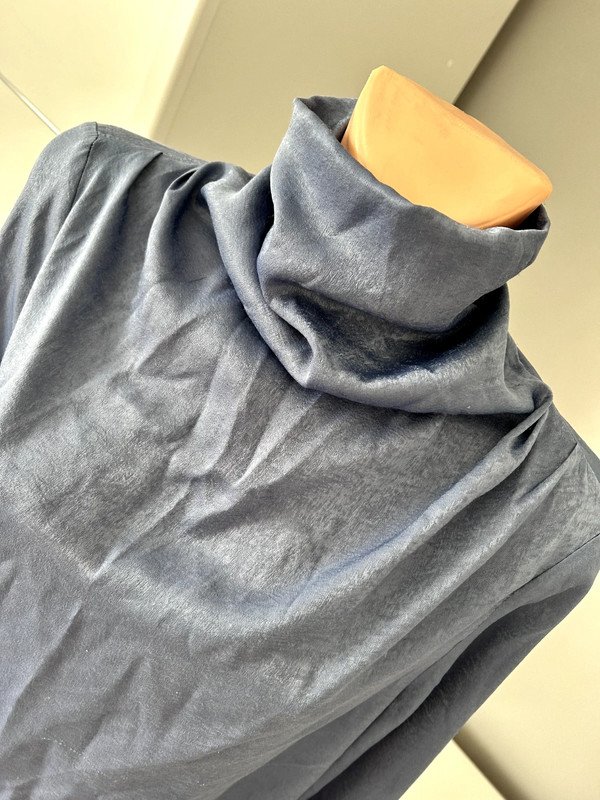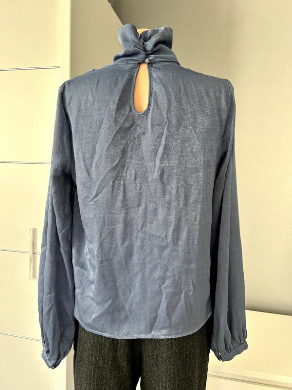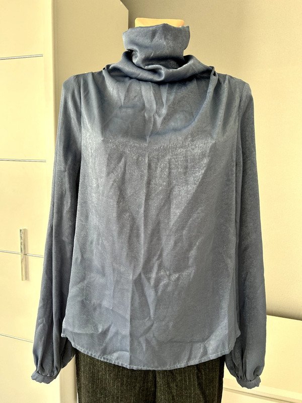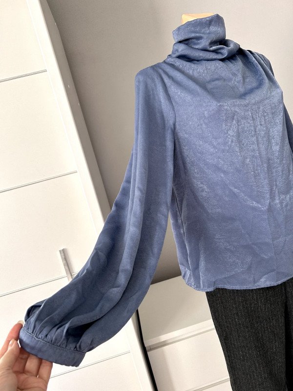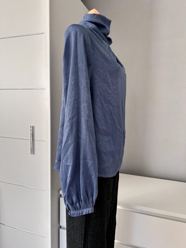 Bluzka z golfem Shein rozmiar z metki L 40/42, zimny niebieski kolor indygo ( pierwsze zdjęcie oddaje rzeczywisty kolor bluzki, na większości zdjęć aparat z uporem mocno przekłamuje kolor ). Lejący się golf, drapowania na ramionach, szerokie balonowe, eleganckie rękawy z mankietem zapinanym na materiałowy guziczek. Golf zapinany na karku na 2 guziki materiałowe, pod nim na plecach ozdobna łezka. Bluzka elegancka, oryginalna, niebanalna i niespotykana. Old money style, szafa kapsułowa.Polecam