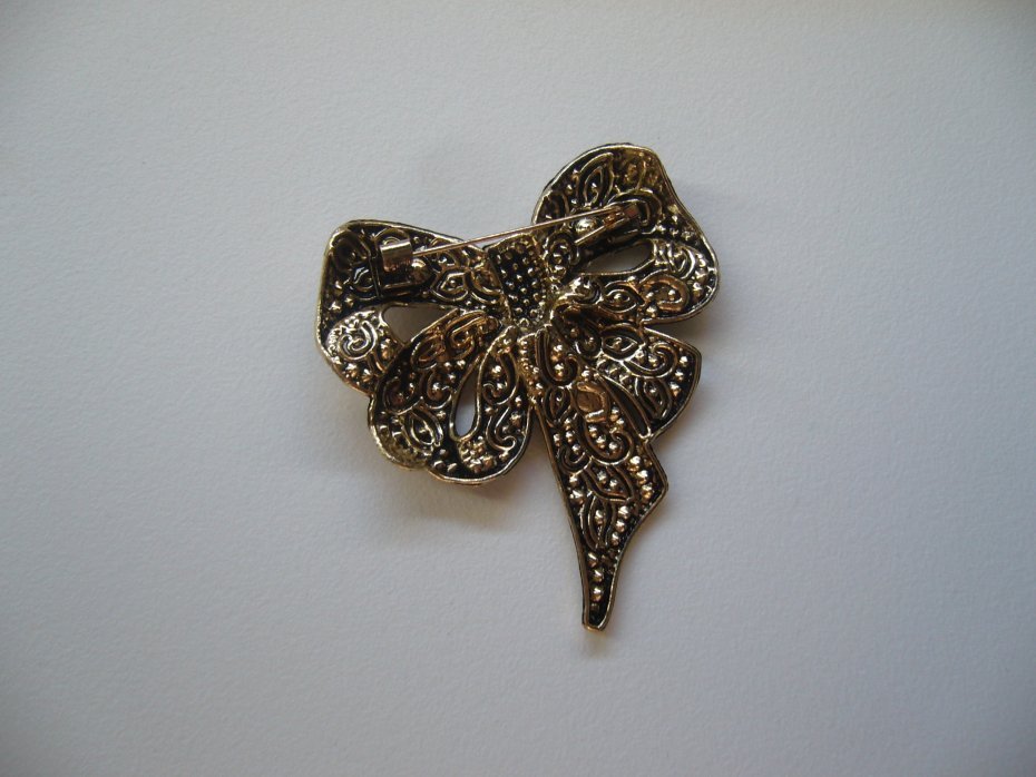 POZŁACANA BROSZKA KOKARDA ZDOBIONA KOLOROWYMI KRYSZTAŁKAMI