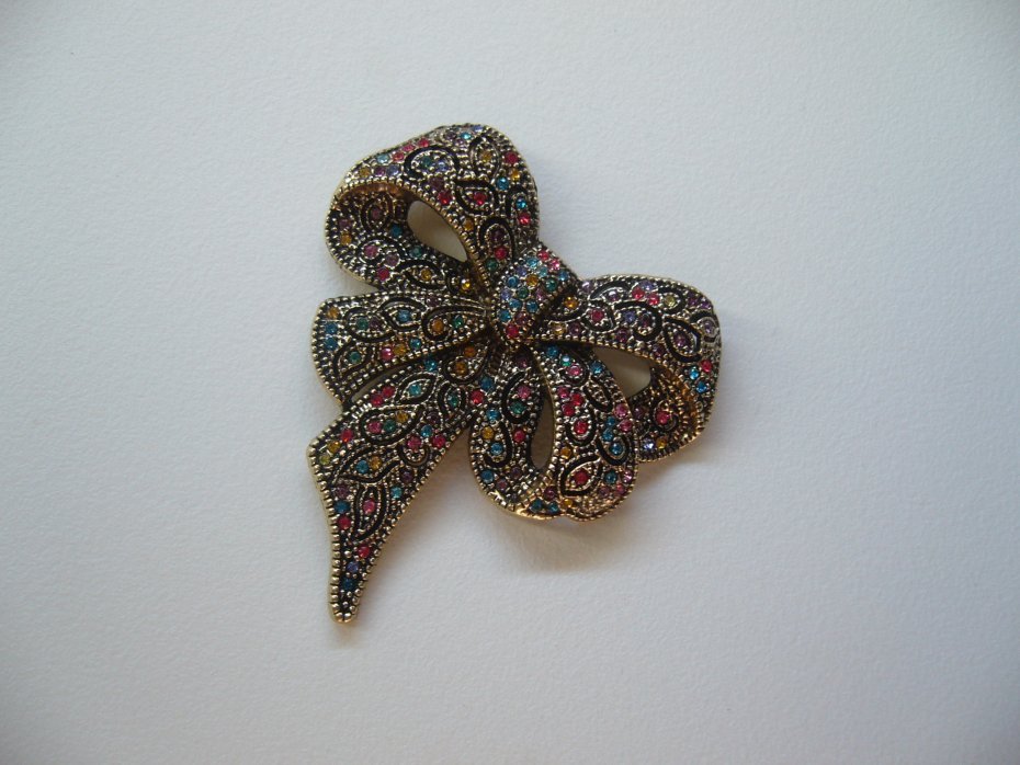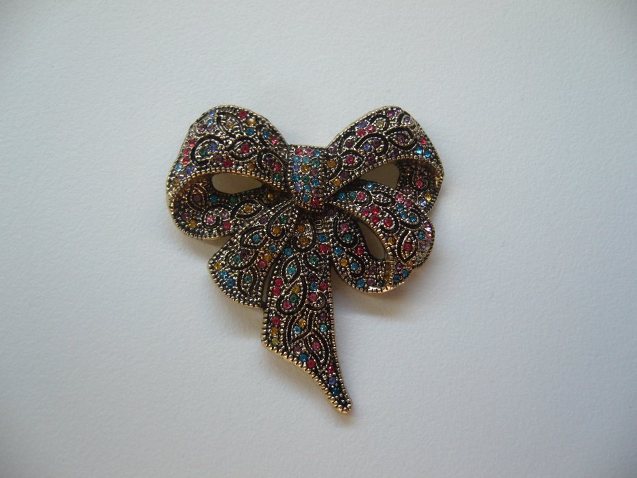 POZŁACANA BROSZKA KOKARDA ZDOBIONA KOLOROWYMI KRYSZTAŁKAMI