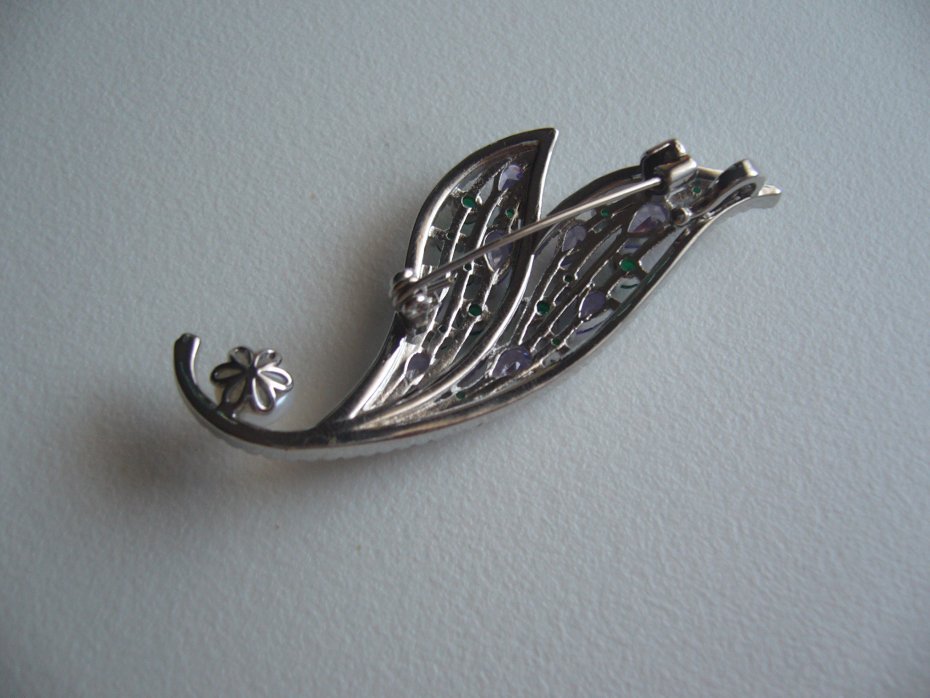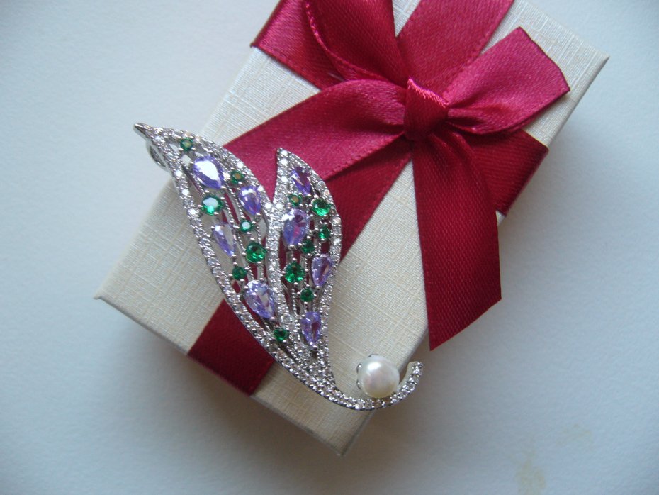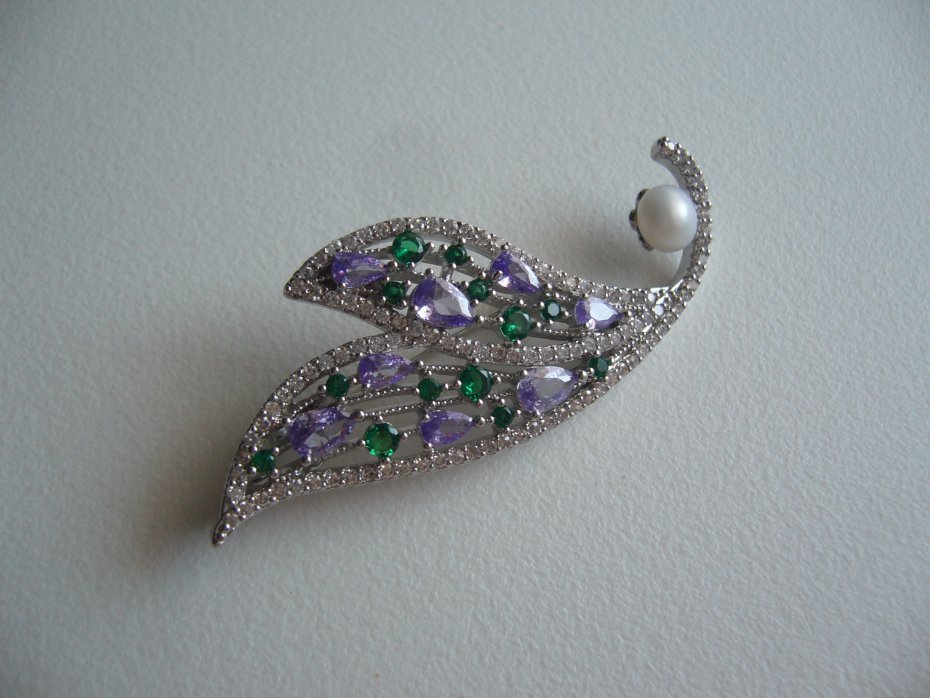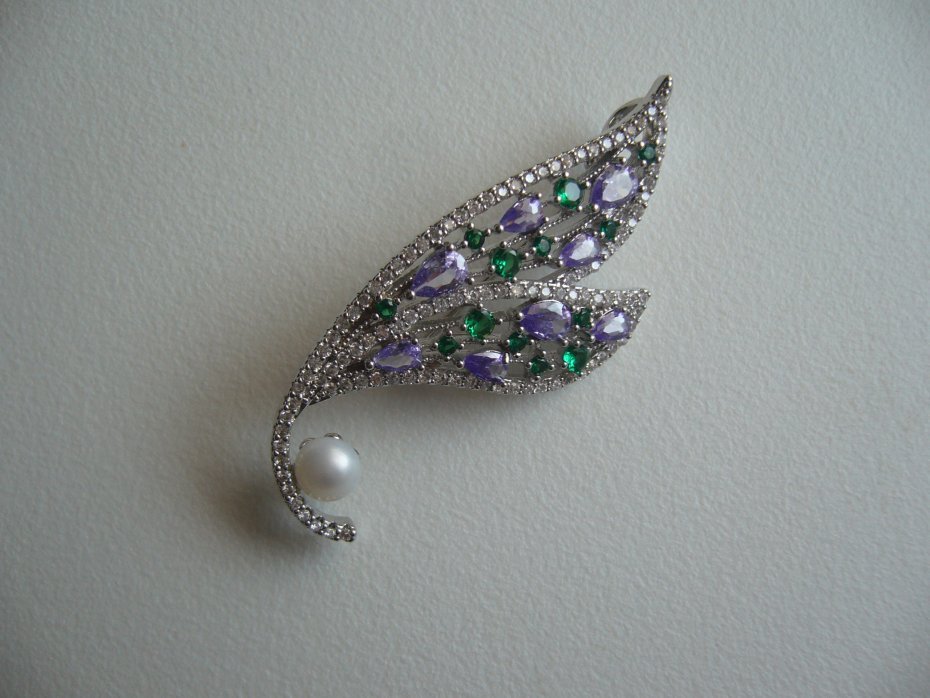 PIĘKNA POSREBRZANA BROSZKA LIŚCIE WYSADZANA SZKLANYMI CYRKONIAMI ZDOBIONA PERŁA