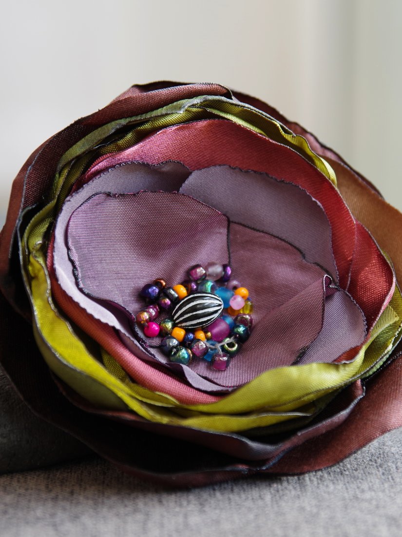 Modna broszka przypinka KWIATEK ręcznie wykonana z satynowych płatków, dodatkowo ozdobiona małymi koralikami.