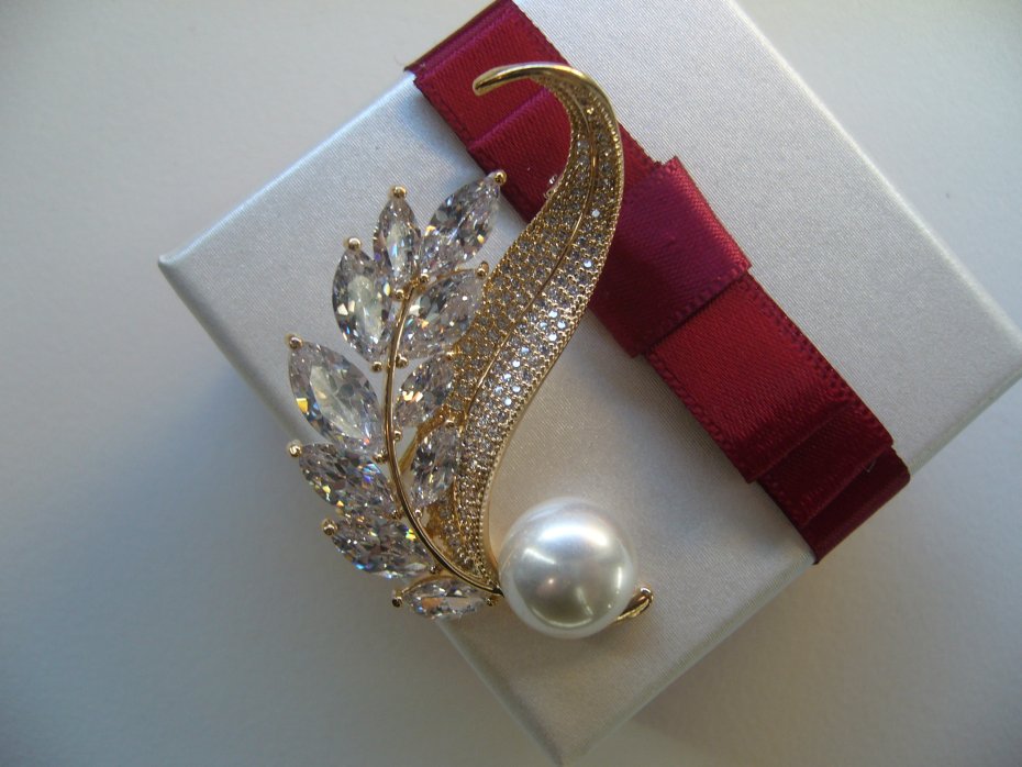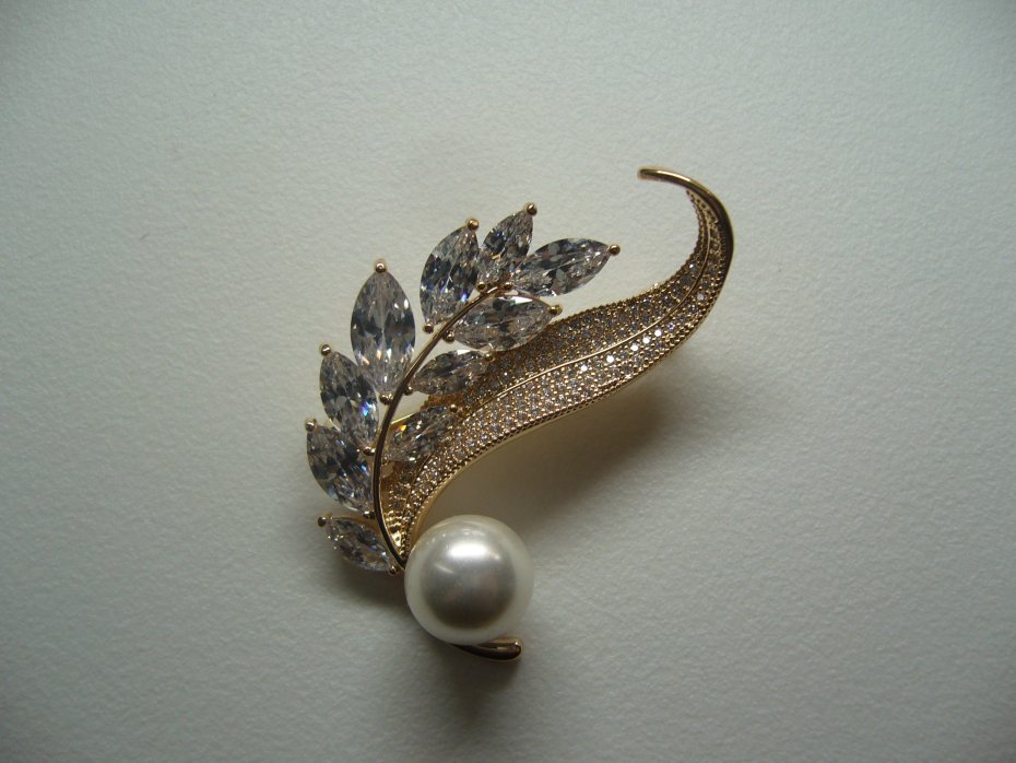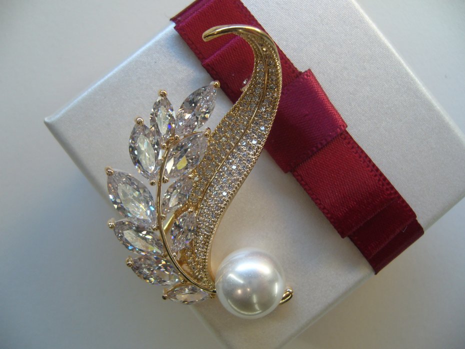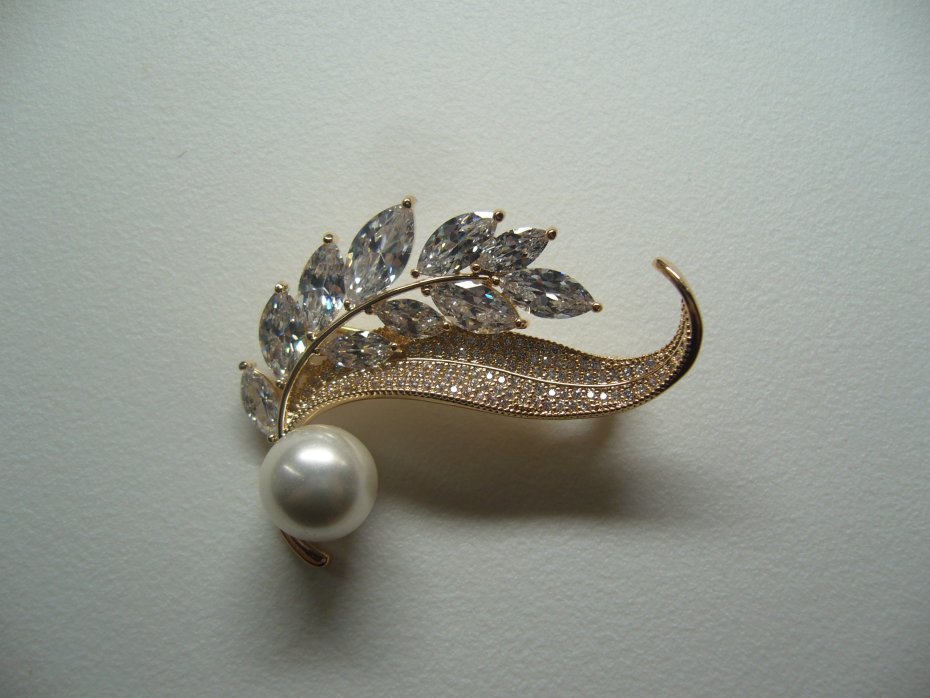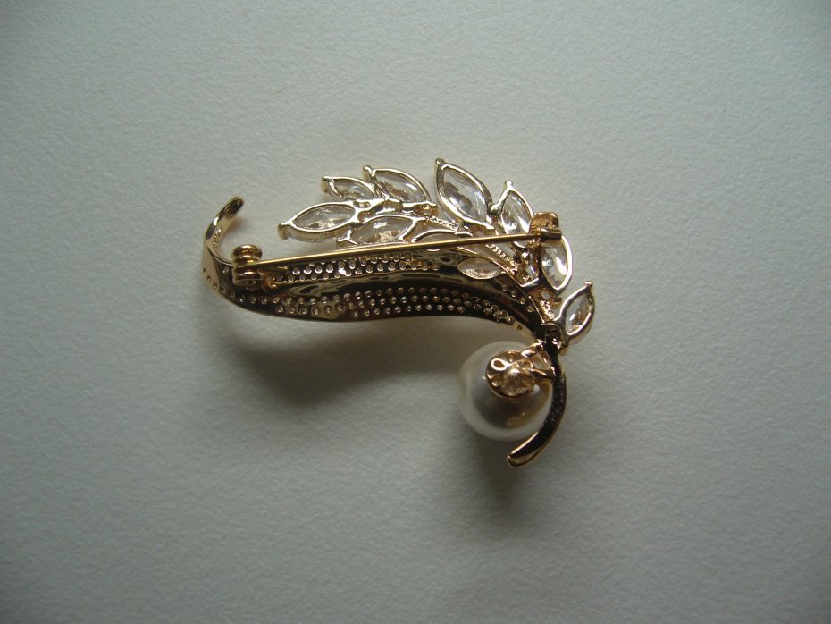 PIĘKNA POZŁACANA BROSZKA WYSADZANA SZKLANYMI CYRKONIAMI ZDOBIONA PEREŁKĄ