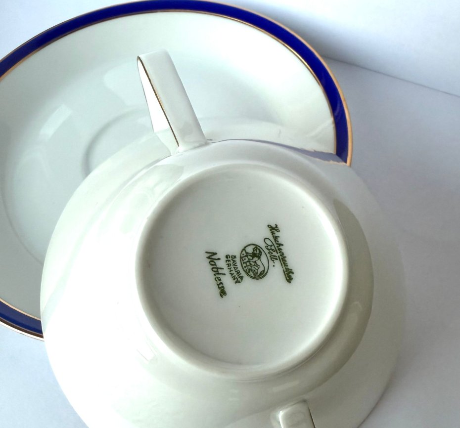 Na spodzie bulionówki oraz talerzyka znajduje się oryginalna sygnatura stosowana w latach 40–50 XX wieku, co potwierdza autentyczność i wiek przedmiotu.