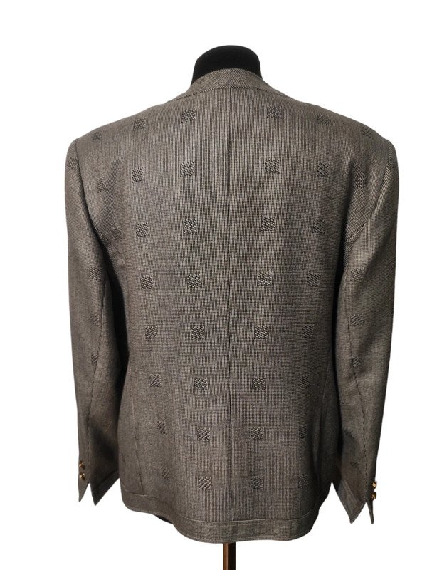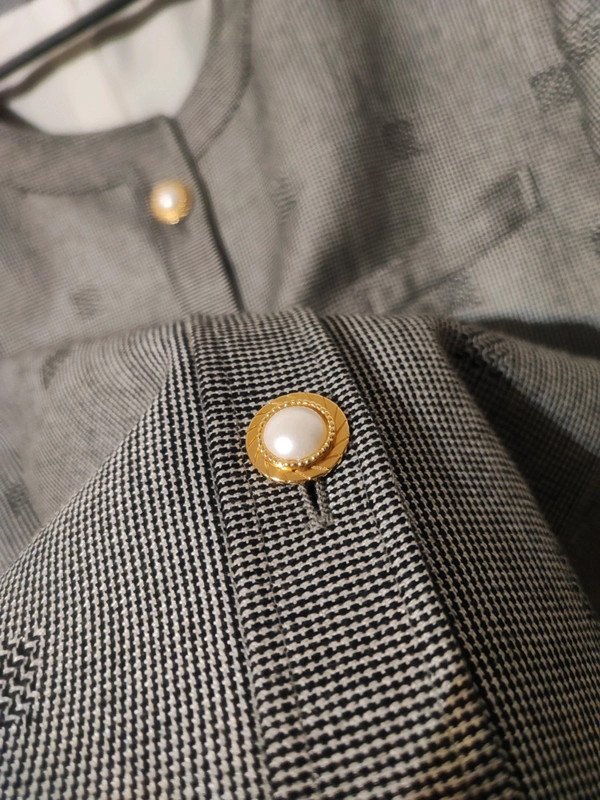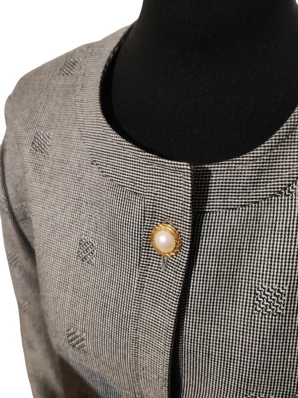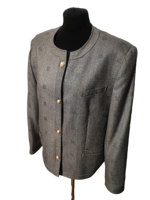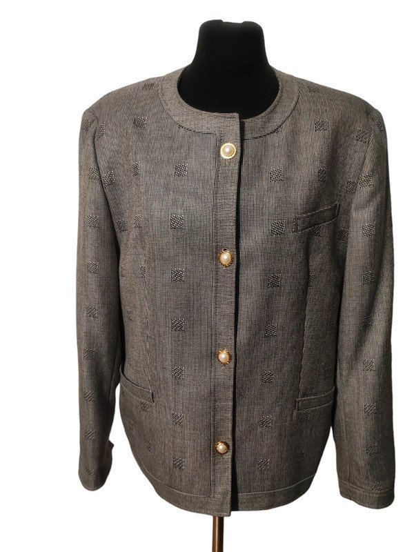 Czarno-biała marynarka vintage marki Marcona w elegancką pepitkę i geometryczne wzory. Klasyczny, ponadczasowy fason bez kołnierza, zapinany na ozdobne biało-złote guziki z perłowym wykończeniem. Idealna do pracy, na spotkania biznesowe lub jako stylowy akcent do codziennych stylizacji. Stan bardzo dobry – brak widocznych śladów użytkowania.
