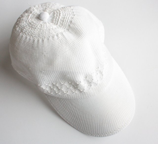 Urocza, ażurowa czapeczka z lekko uciągliwej dzianiny w kolorze białym. Z tyłu regulacja obwodu na rzep. Usztywniany daszek.