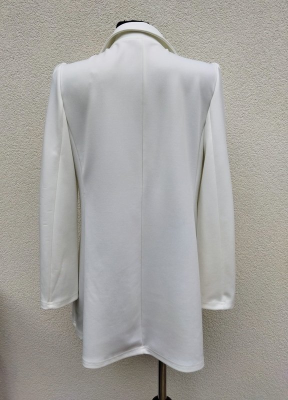 Dłuższa elegancka marynarka z poliestrowej tkaniny z elastanem w kolorze mlecznej bieli . Fason otwarty z kołnierzem z rewersami, z dwiema patkami imitującymi wpuszczane kieszenie. Uroku dodają jej naszywane z przodu i na mankietach ozdobne grawerowane guziki w złotym kolorze. Bez podszewki.
