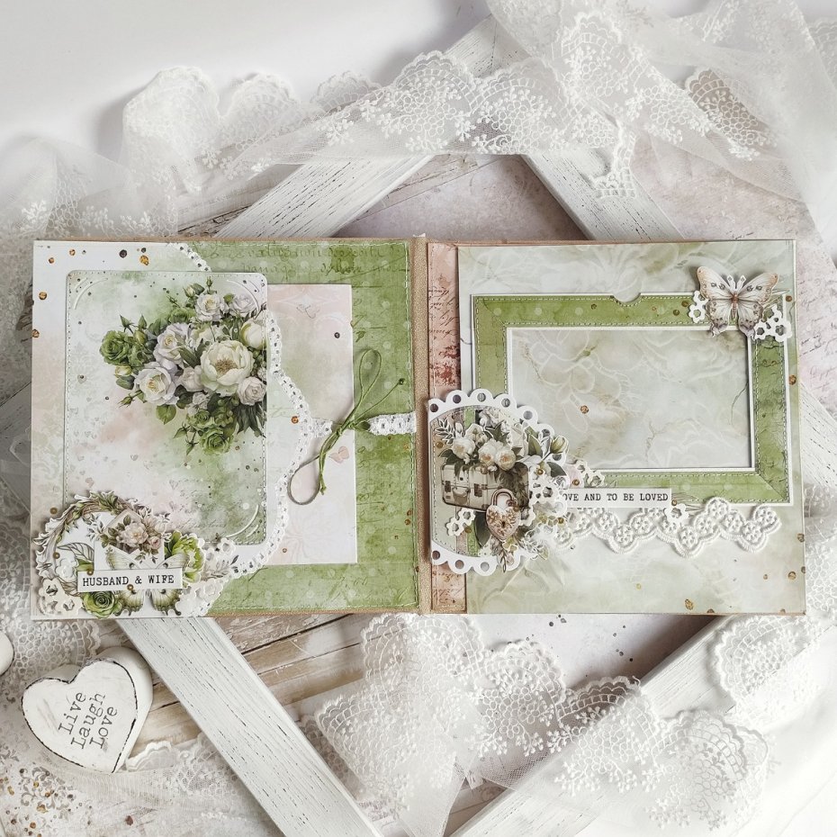 Album ślubny do przechowywania najcenniejszych wspomnień z dnia ślubu, wykonany z wysokiej jakości papieru i ozdobiony przestrzennymi kwiatami z tkaniny, koronką oraz drobnymi koralikami.