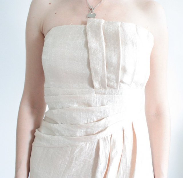 Wspaniała, elegancka, kremowa sukienka na podszewce, wzmocniona fiszbinami. W górnej części silikonowy pasek sprawiający, że sukienka dobrze przylega do ciała.Zapięcie na długi suwak z tyłu.