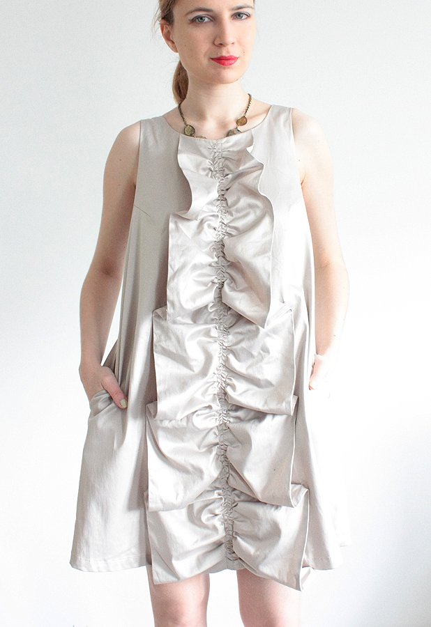 Elegancka sukienka z fantazyjną falbaną z przodu marki THIS IS WHO I AM. Posiada podszewkę, suwak na boku i boczne kieszenie.