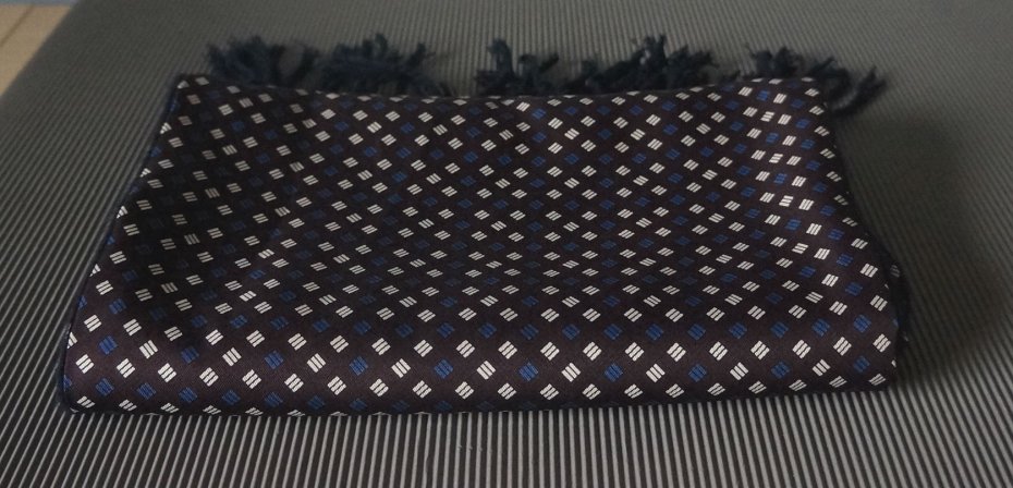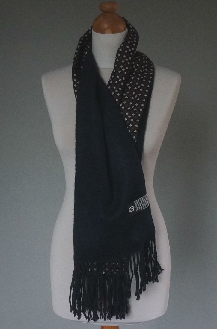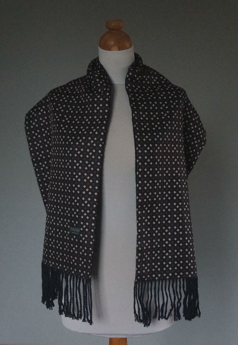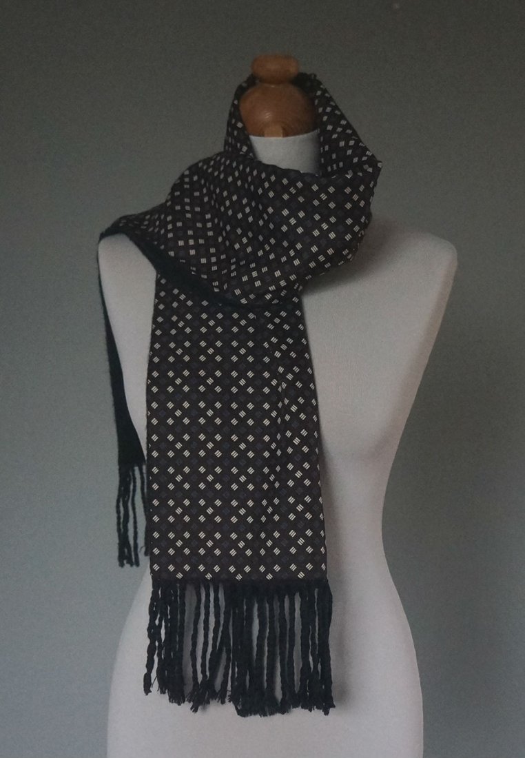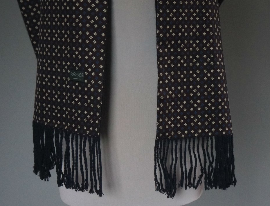 Bardzo elegancki męski szal. Firma Canda. Wyprodukowany dla C&A. Szal dwustronny. Strona zewnętrzna - 100% poliester, strona wewnętrzna 100% akryl. Kolorystyka i wzór ponadczasowy. Bardzo miękki i miły w dotyku. Stan bardzo dobry.