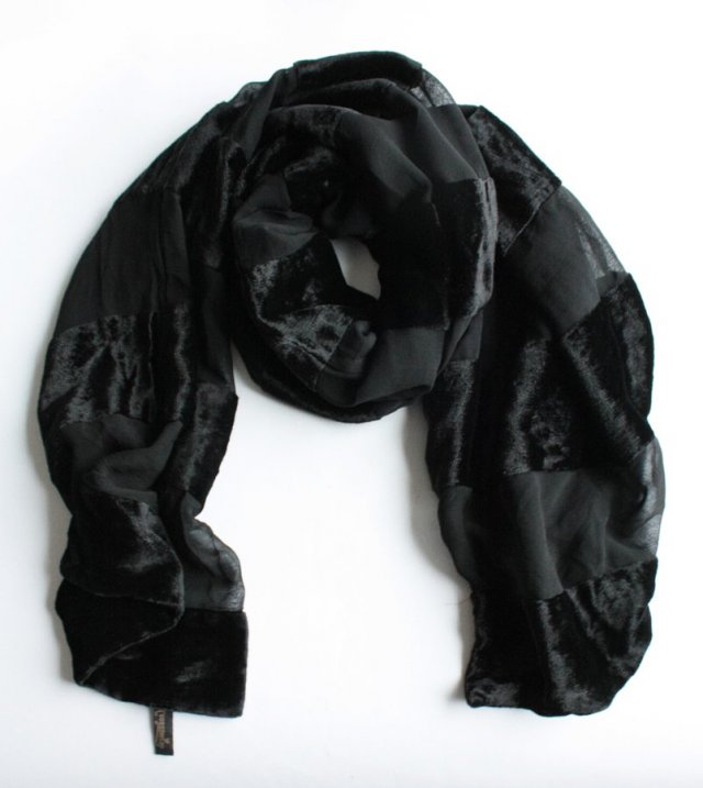 Elegancki czarny szal podwójnie zszyty z tkaniny o niejednolitej strukturze - miejsami materiał jest cienki, półtransparentny, w innych miejscach przypomina welur.