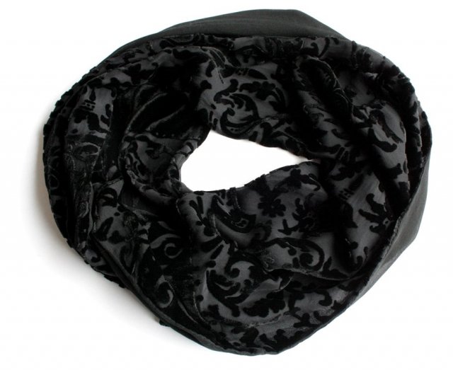 Elegancki czarny szal podwójnie zszyty z tkaniny o niejednolitej strukturze - miejsami materiał jest cienki, półtransparentny, w innych miejscach przypomina welur.