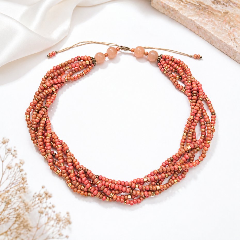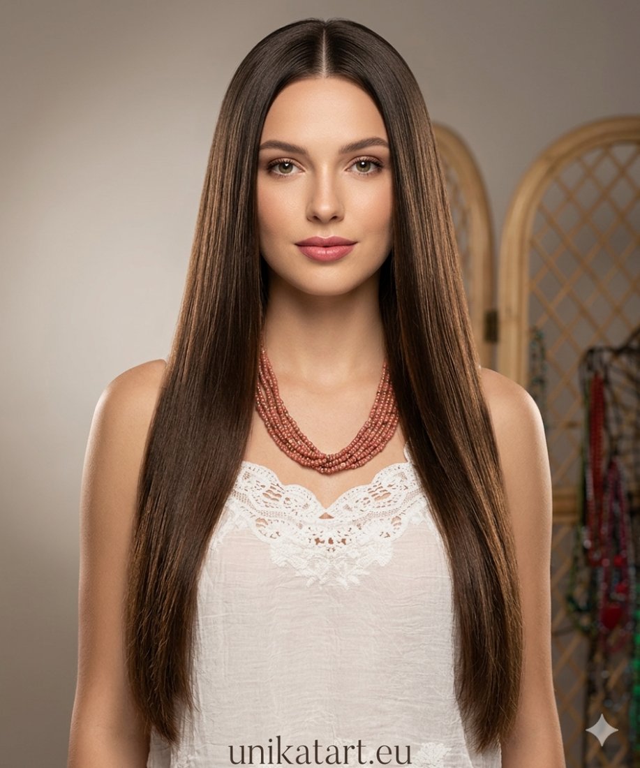 Ten ręcznie pleciony choker makrama to hołd dla tradycyjnego rzemiosła i nowoczesnego designu, stworzony z myślą o kobietach, które kochają unikalną biżuterię "z duszą". Pomiędzy karmelowymi koralikami ukryte są złote koraliki w różnorodnych kształtach. Naszyjnik wyposażony jest w praktyczne zapięcie przesuwne (węzeł makrama), które pozwala na płynną regulację długości. Dzięki temu idealnie dopasujesz go do obwodu swojej szyi.