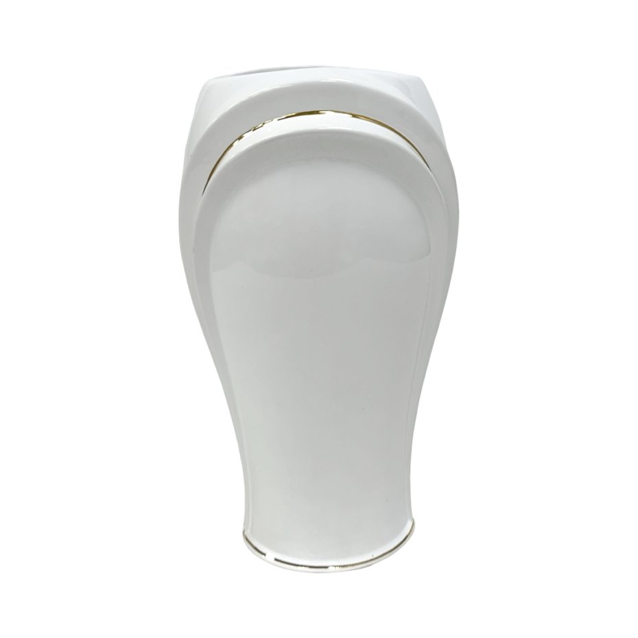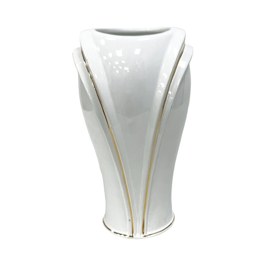 Materiał: Porcelana wysokiej jakości, pokryta błyszczącym, śnieżnobiałym szkliwem. Zdobienie w postaci delikatnych złotych linii biegnących wzdłuż pionowych żeber wazonu oraz przy dolnej krawędzi podstawy.
