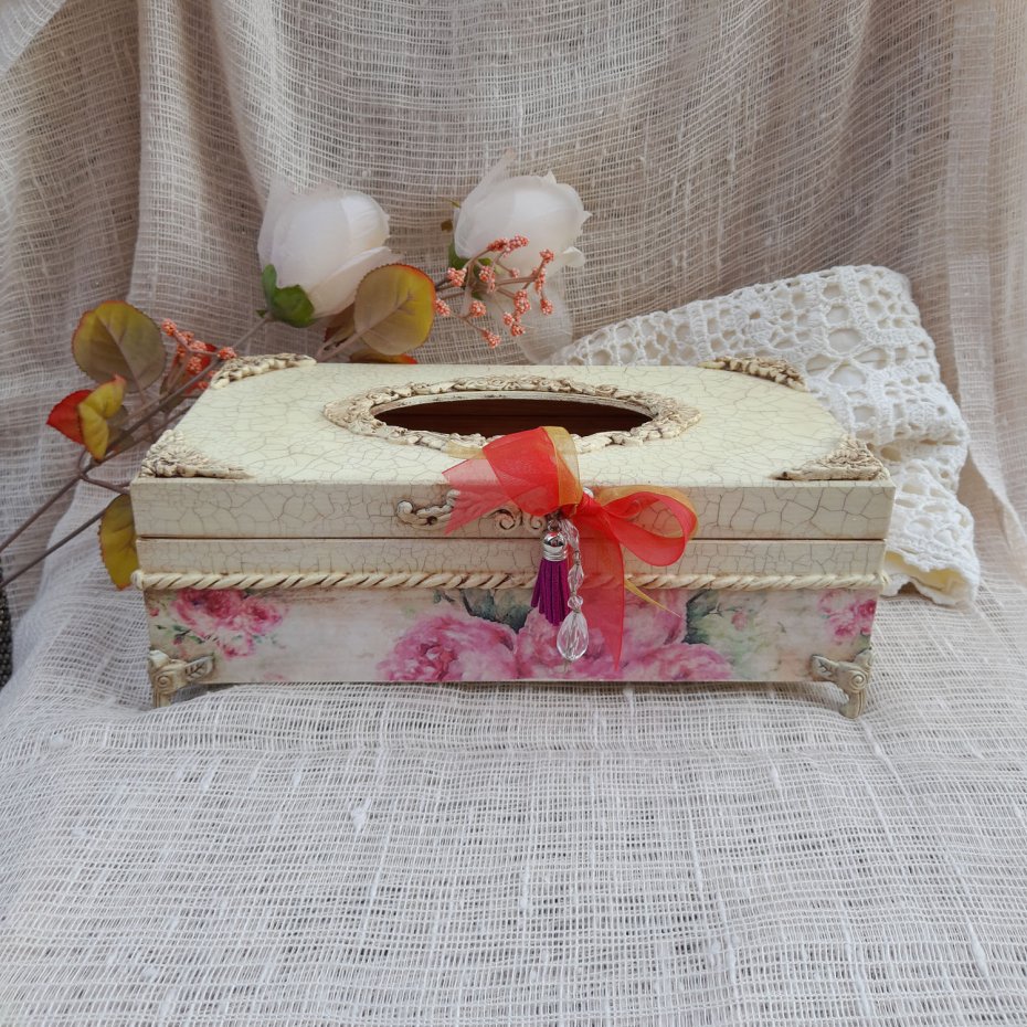 Ten wyjątkowy chustecznik to połączenie elegancji i ręcznego rzemiosła. Pokryty delikatnym, postarzałym efektem spękań oraz ozdobnymi narożnikami prezentuje się niezwykle stylowo. Florystyczne motywy w pastelowych barwach nadają mu romantycznego charakteru, a dekoracyjna kokarda z zawieszkami dodaje uroku i subtelnego blasku. Idealny jako dekoracja salonu, sypialni lub łazienki — nie tylko praktyczny, ale też piękny element wystroju wnętrza.