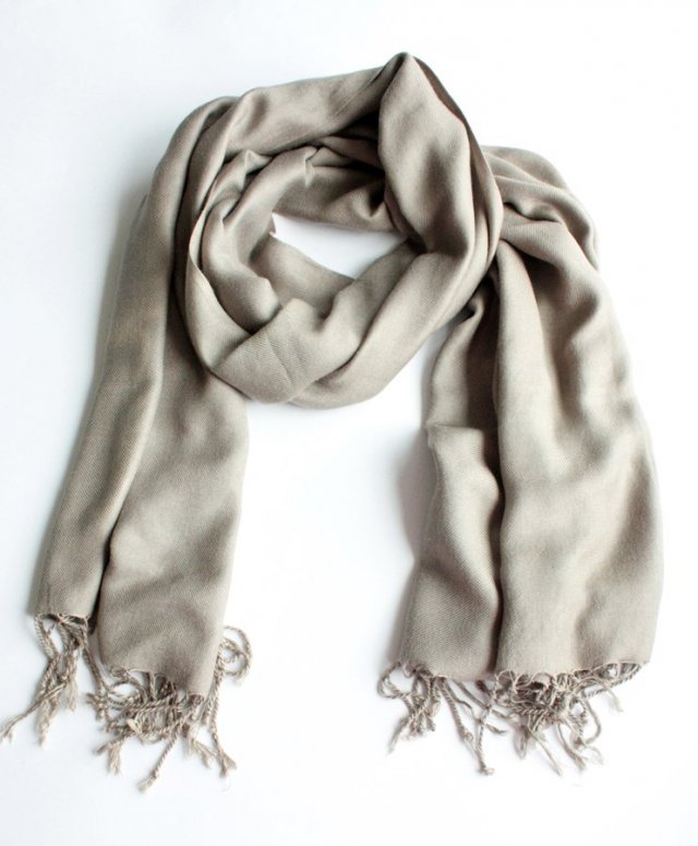 Jednolity, elegancki szal w stonowanym odcieniu szarości wpadającej w zgaszoną zieleń. Materiał to prawdopodobnie wiskoza.