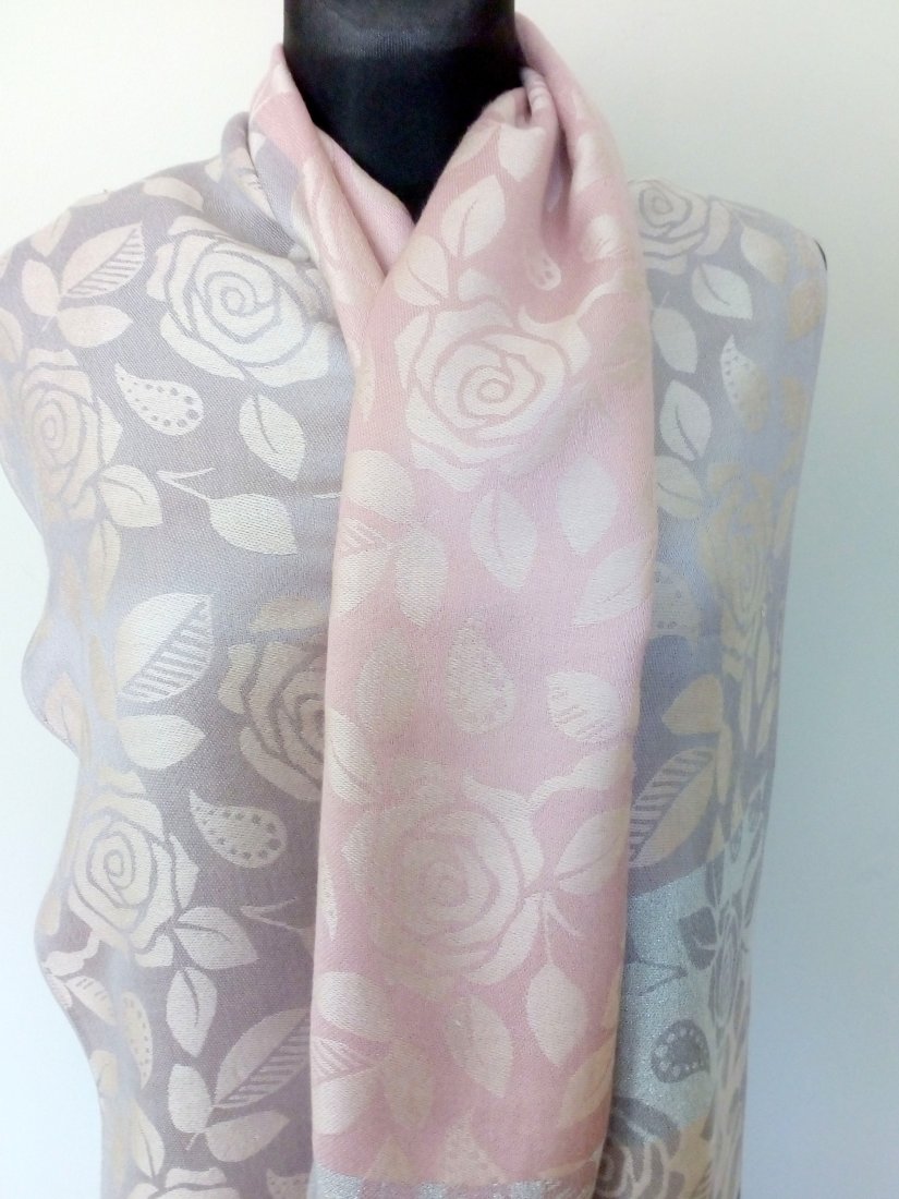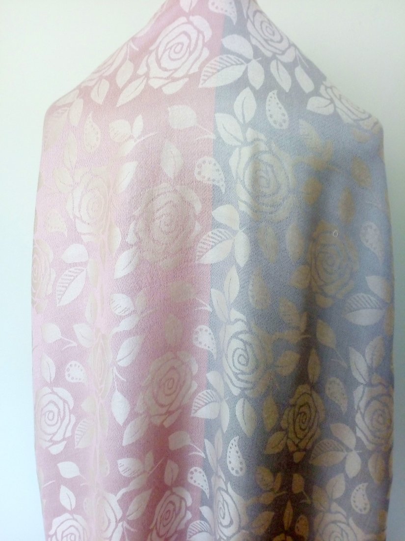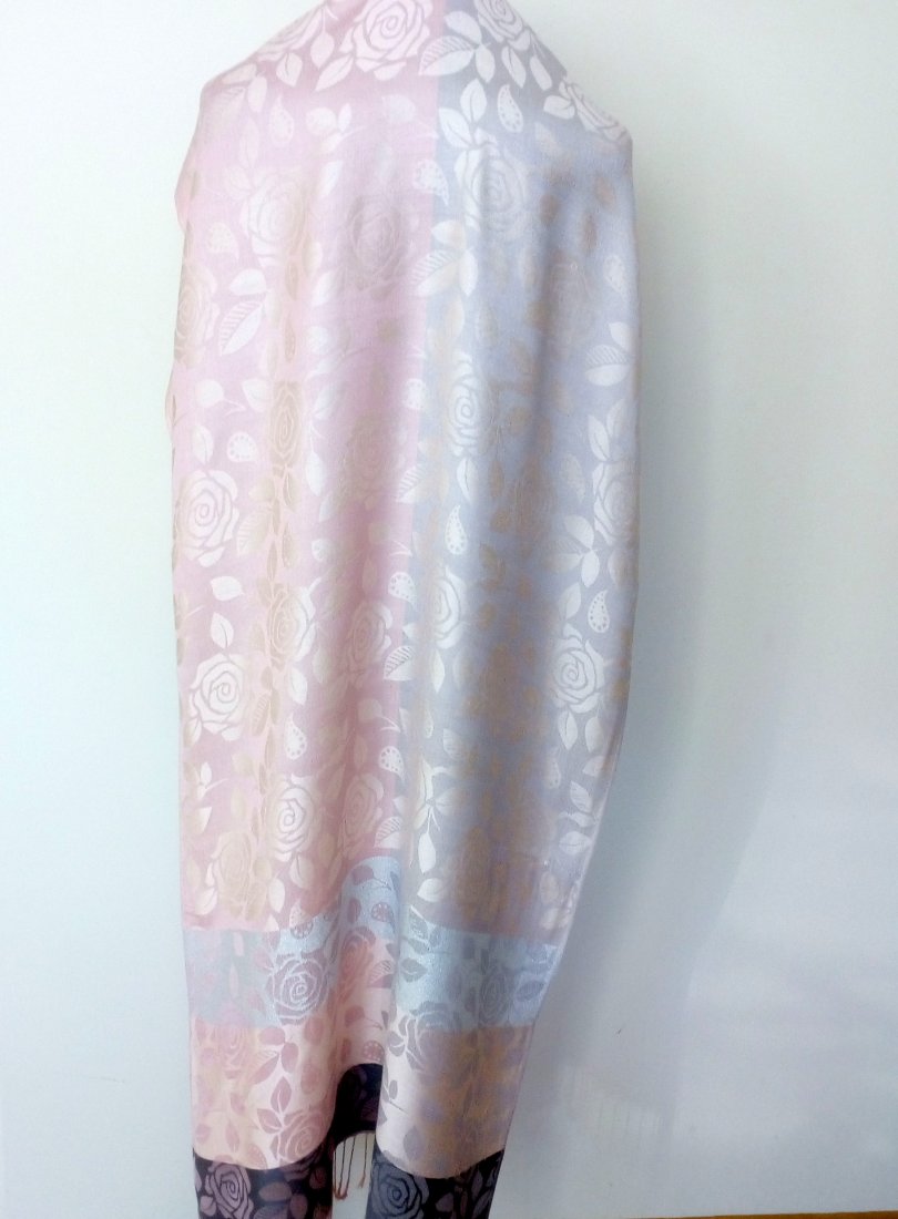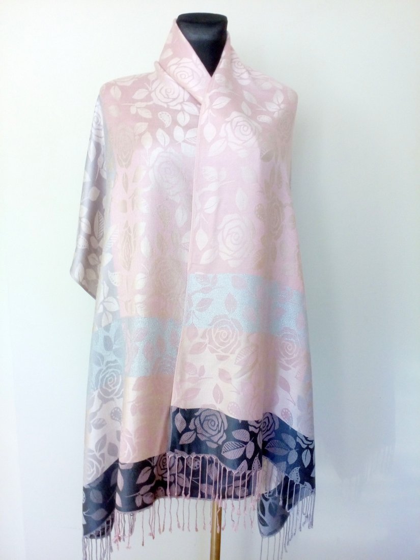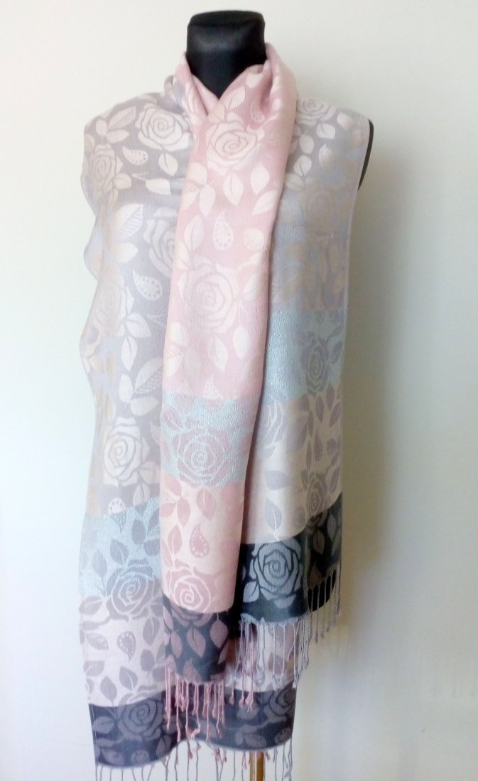 bardzo ładny szal, sadzę, że z udziałem jedwabiu, w pięknej, stonowanej, pastelowej kolorystyce