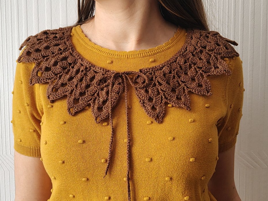 Stylowy koronkowy kołnierzyk wykonany ręcznie z bawełnianej włóczki na szydełku.