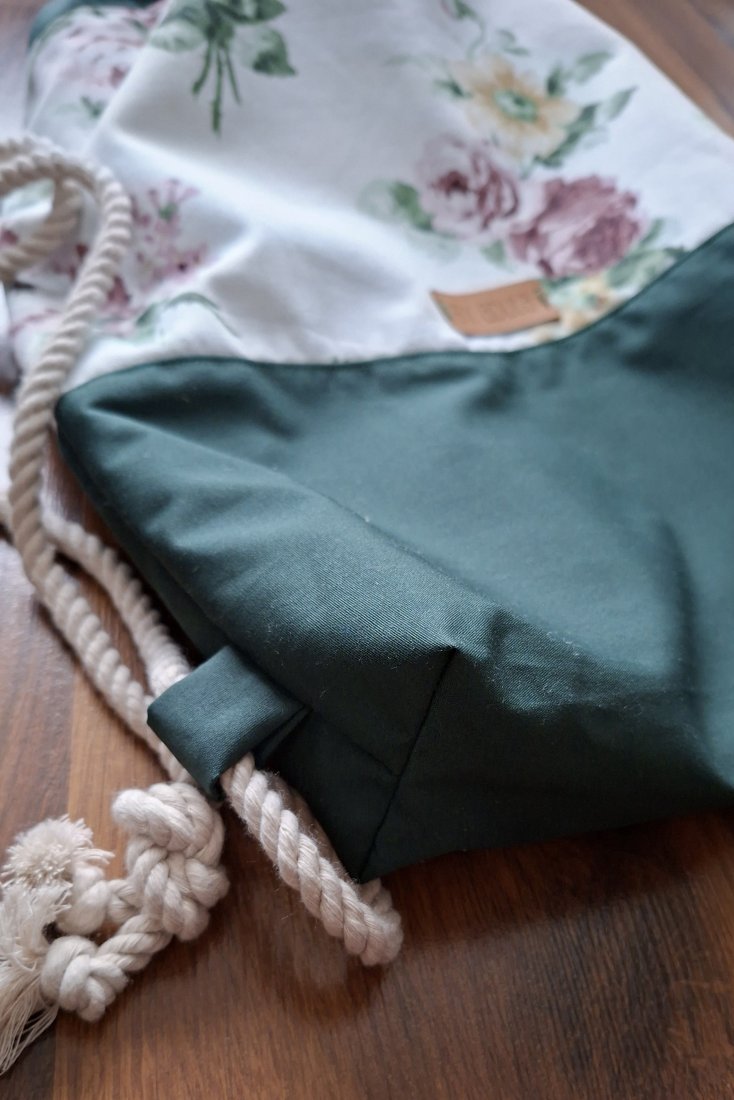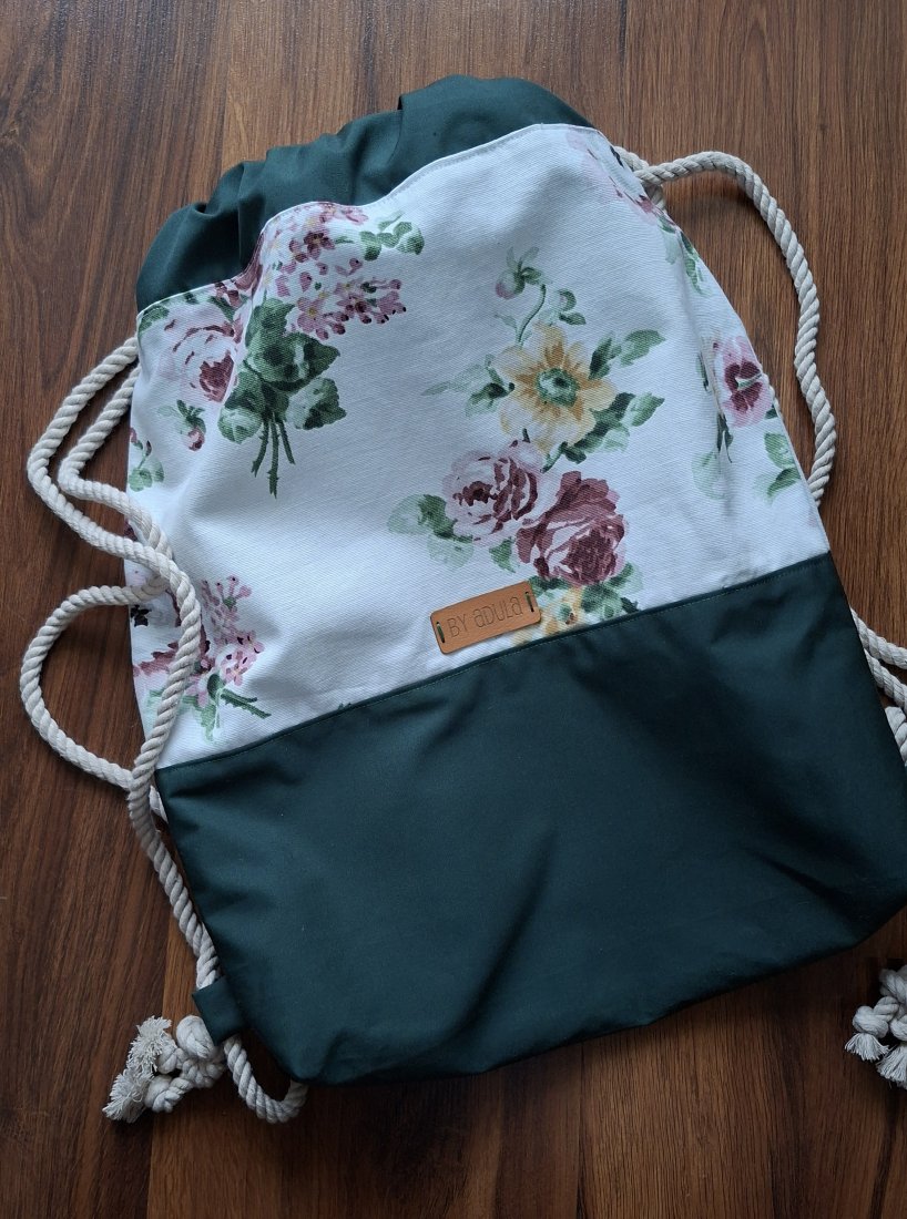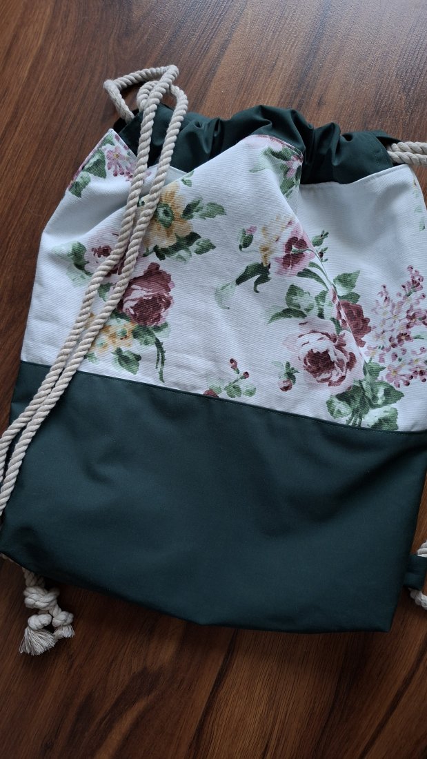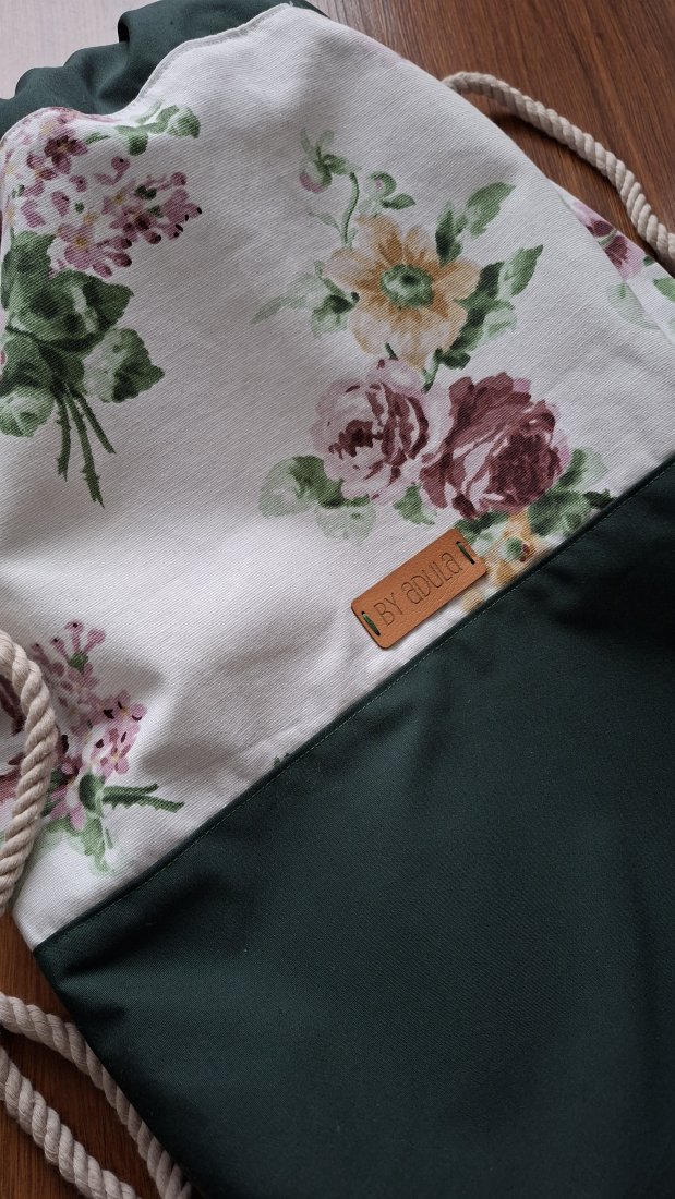 Design z nutą nostalgii: górna część plecaka zachwyca przepięknym, kwiatowym motywem róż w stylu retro, który idealnie komponuje się z dolnym panelem w kolorze głębokiej, butelkowej zieleni.