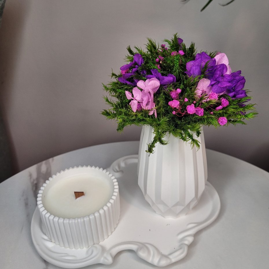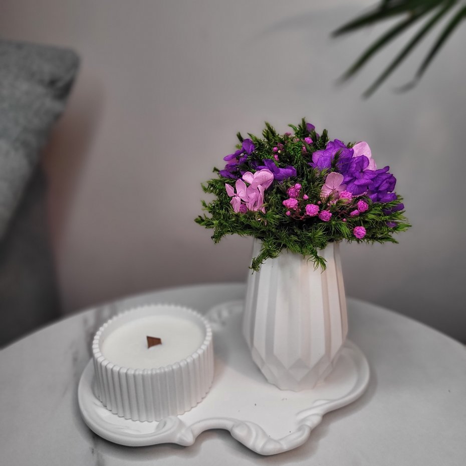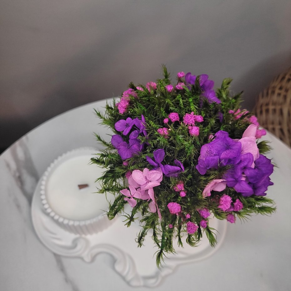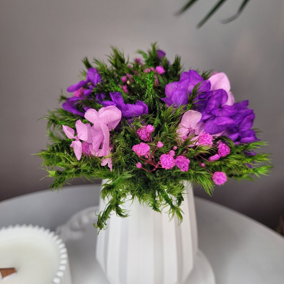 Ozdobiona elegancką kompozycją z mchu stabilizowanego i suszonych kwiatów, która zachowa swoją świeżość na długi czas.